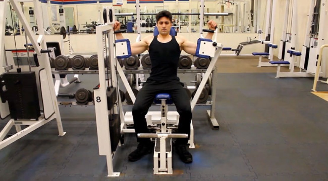 هذا التمرين يسمح لك بأقصي قدر ممكن لفرد الذراعين من خلال ضبط المعقد لأعلي أو لأسفل علي حسب ما يناسبك . كل ما يتطلب منك هو الجلوس علي الجهاز وإختيار الوزن المناسب والعمل علي تقريب يديك إلي بعضهما البعض والضغط عضلات الصدر .