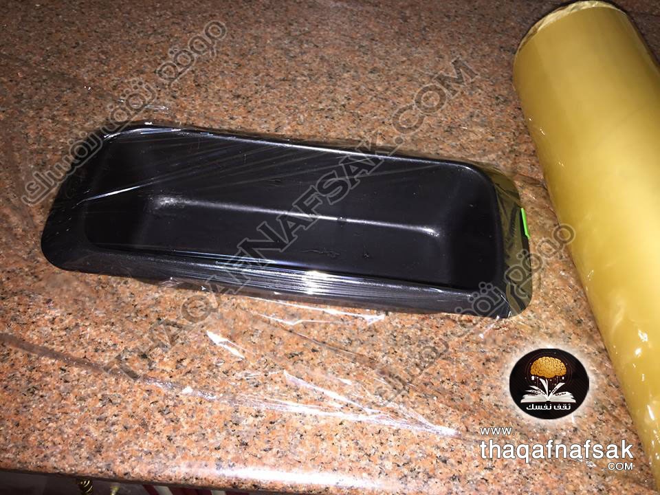 - كالصورة الأولى تمام ضعي رول البلاستيك الأستريتش وأمامة صينية الكيك