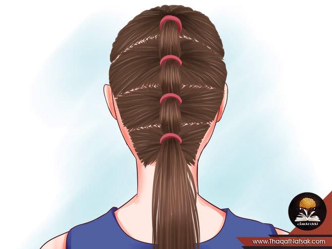جمع النصف الأخر من الشعر ، و تقسيمه بالتساوي إلي ثلاثة أشكال من ذيل الحصان في المنتصف و الأعلي . و وضع النصف الثاني من الشعر لأعلي .
