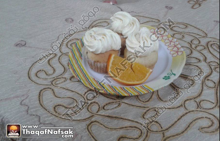 • تزين حبات الكب كيك بعد ان تبرد بالكريمة بواسطة كيس الحلوانى