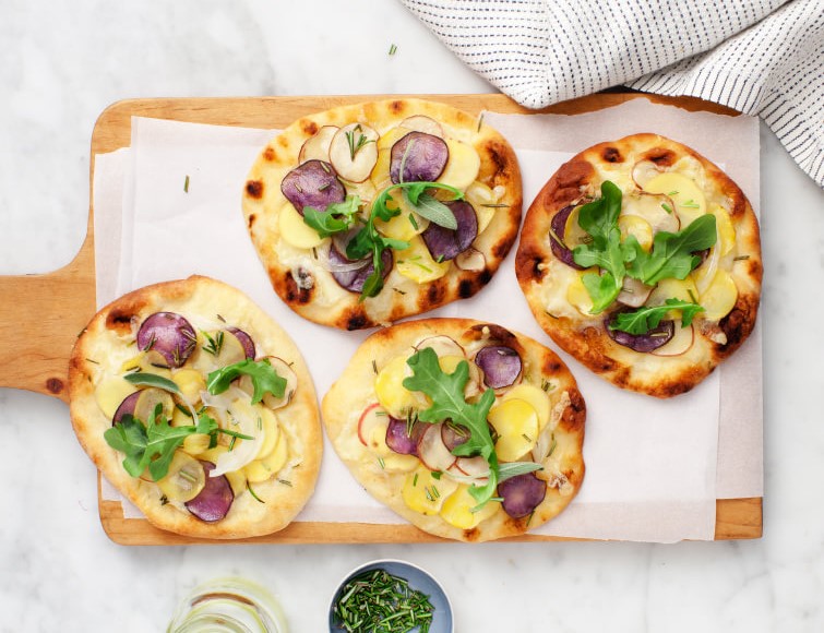 - فى بولة صغيرة , قومى بخلط زيت الزيتون مع الثوم المفروم و قومى بفركه على خبز النان . ثم ضعى الجبنة المبشورة و البصل و البطاطس على الوجه كى يصنعوا طبقة رقيقة جدا على فوق الخبز . رشى القليل من الملح بالملاحة و القليل من الروزمارى المطحون . رش زيت الزيتون ايضا عليها برفق و اخبزيها لمدة من عشر لاثنى عشر دقيقة او اتركيها حتى تنضج البطاطس تماما
