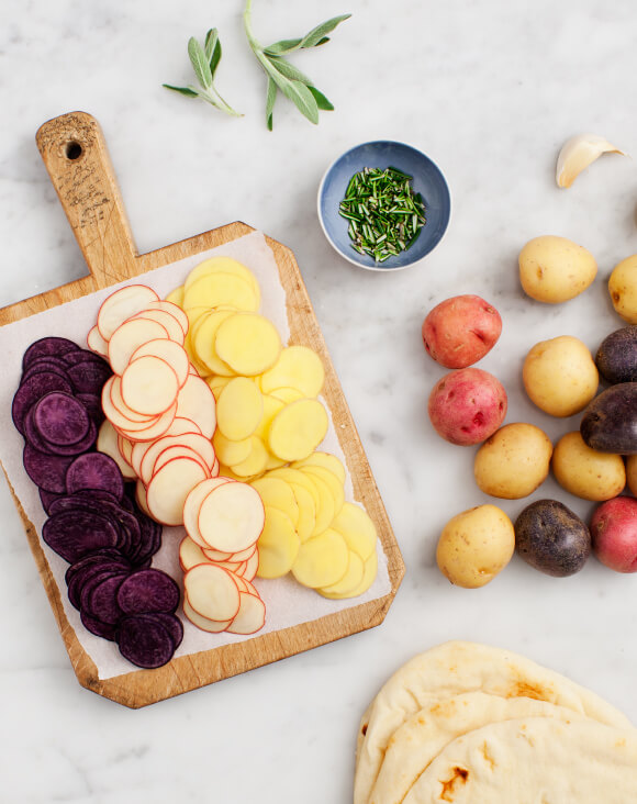 لعمل ميني بيتزا البطاطس عليك الحصول على بعض البطاطس الملونة الصغيرة . على سبيل الجد ان لم تجد تلك التشكيلة الفريدة من البطاطس عليك فقط اختيار البطاطس الصغيرة او هناك بطاطس صغيرة جدا و جديدة يمكن ان تجديها فى المحلات ( لقد وجدتها على هوول فوود Whole Food ) . من الافضل ان تقطعيها شرائح على الماندولين حتى تنضج البطاطس سريعا و تصبح مقرمشة قليلا من الاطراف .