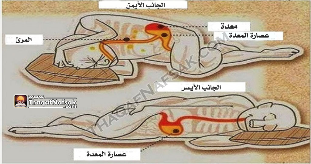 تحسن عملية الهضم اذا تحدثنا عن عملية الهضم فان النوم على الجانب الايسر يفضل عن النوم على الجانب الايمن و يرجع ذلك الى سبب بسيط جدا الا وهو الجاذبية . فالنوم على الجانب الايسر يسمح لفضلات الطعام ان تتحرك بسهولة من الامعاء الغليظة الى القولون ( مما يعنى انك ستحتاج ان تتغوط بمجرد ان تستيقظ من النوم ) . كما ان النوم على الجانب الايسر يساعد على تماسك المعدة و البنكرياس ( فالمعدة موجودة بالجانب الايسر من اجسادنا )، و هذا سيحافظ على زيادة انزيمات البنكرياس واى عملية اخرى من عمليات الهضم . ( كى ترى هذذ العملية بعينيك انظر للصورة السابقة )