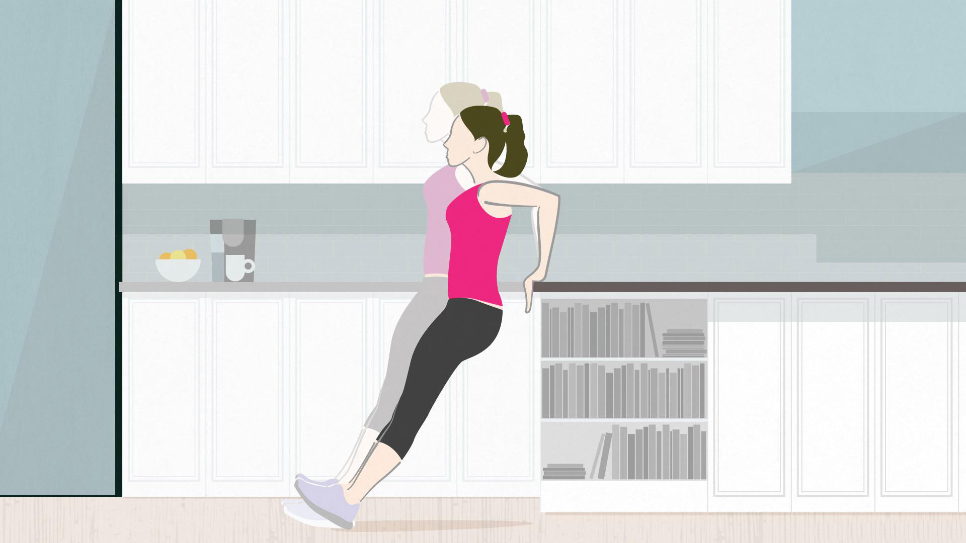 قفي أمام الطاولة و مدي زراعيك مع عمل مسافة بينهم و اليدين تمسك بحافة الطاولة. و تذكري كلما ابتعدي عن الطاولة كلما كان التمرين أصعب. لذلك حددي قوة التمرين علي حسب طاقتك. وايضاً تأكدي من أرتداء أحذية مناسبة حتي لا تسقطي.