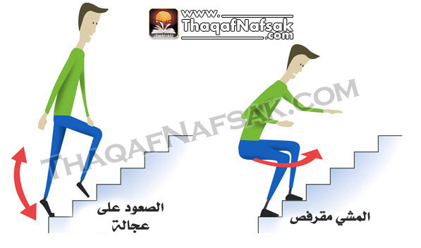 حاول أن تتخذ خطوات طويلة عند صعود السلم علي قدر الأمكان حتي لا تسبب الأجهاد لمنطقة الأفخاد عندما تثني رجليك.