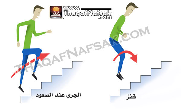 هي طريقة أخري لصعود السلم و لكن مع ضربات قلب أهدي . قف علي رجلك بشكل موازي ثم أقفز عدة خطوات مرة واحدة. هناك طرق عديدة للقفز عند طلوع السلم و لكن كن حذراً حتي لا تسقط أو تجرح.