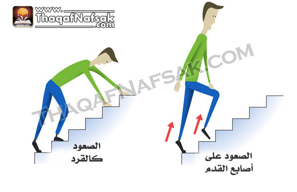 عند الصعود, ضع قدميك علي حافة كل خطوة من السلالم و ادفع جسمك لأعلي.