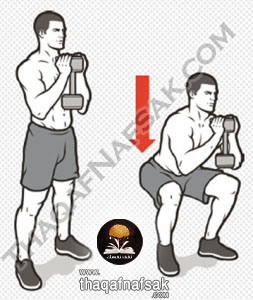 الوقوف مع قدمين متباعدين   بعرض الكتفين ومسك الدمبل  في كلتا اليدين وتوجيه راحتي اليدين لبعضهما . ثم البدء في إتخاذ وضعية القرفصاء بدفع الوركين إلي الخلف لشد عضلات البطن جيداً وخفض الجسم مع رفع اليدين بالدمبل إلي أعلي أمامك والوقوف علي هذه الوضعية 5 ثواني .يمكنك تكرار ذلك 8 مرات .