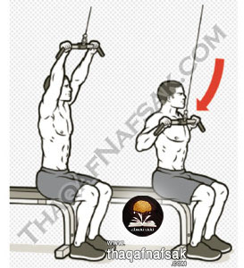 القيام بالجلوس علي ألة الكابلات والإستيلاء علي الكابلات بين يديك . ثم القيام بسحب الكابلات ببطء لفرد ذراعيك حتي يصل الشريط أسفل الصدر يجب أن تمر الكابلات مباشرة من أمام وجهك ثم العودة ببطء بإتجاه وضعية البداية مع تكرار نفس الخطوات 8 مرات .