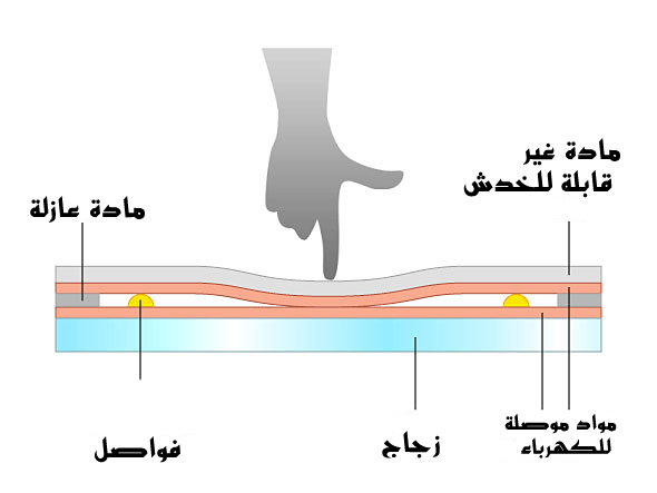 واحدة من الطبقتين الموصلتين مقاومة والأخرى مكثفة وتفصلهما مسافة من النقاط الصغيرة والتي تسمى فواصل تحافظ على ابتعاد الطبقتين حتى يحدث الضغط اللازم للتوصيل. ويوجد فوق هاتين الطبقتين طبقة أخرى رفيعة مقاومة للخدش. تظل الكهرباء تمر عبر الطبقتين المقاومتين الموصلتين حتى يضغط اصبعك على الشاشة توصل الكهرباء بين المقاومة والمطثف ويبدأ التيار في المرور خلال نقطة الضغط. عندها يبدأ البرنامج الخاص بالشاشة في معرفة مكان الضغط عن طريق تحديد الصف والعمود كما في المصفوفة مما ينتج عنها تنفيذ الأمر الخاص بهذه النقطة.
