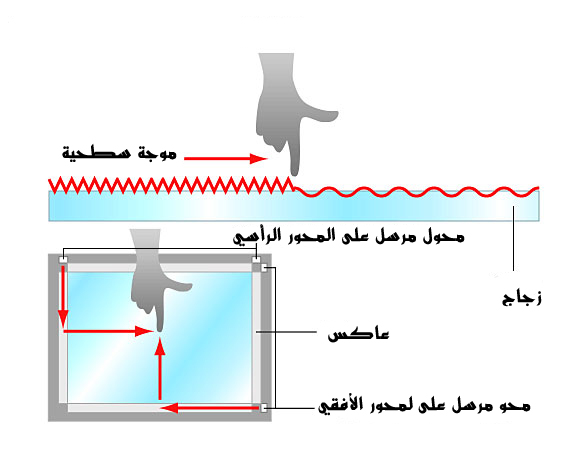 يتكون من محولين أحدها للارسال والآخر للاستقبال في كلا الاتجاهين للصفوف والأعمدة. على سطح من الزجاج. يتم وضع عواكس على الزجاج لتعكس الموجات الكهربية بين المرسل والمستقبل بحيث عندما تقوم بلمس السطح الزجاجي يشعر المستقبل باضطراب في الموجة الكهربية وببعض المعايرة يستطيع تحديد مكانها وهي أفضل شاشة يمكن استخدامها ف عرض الرسومات لأنها تعطيك 100% اضاءة واضحة مما يسمح لك بمتابعة التفاصيل