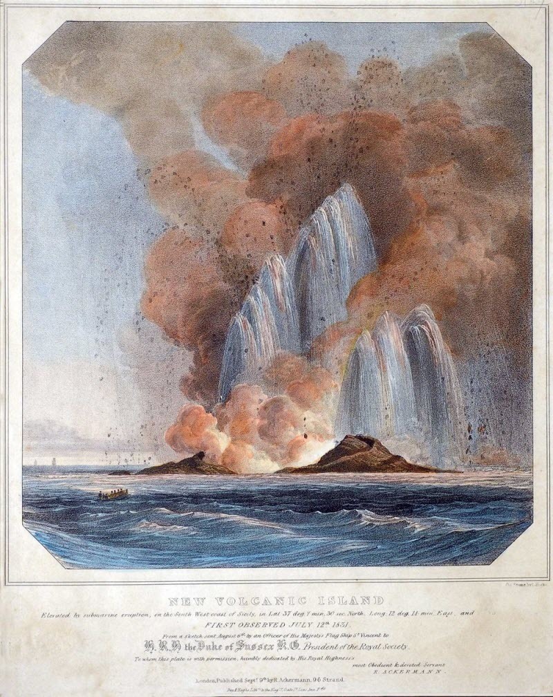 تبدا قصة الجزيرة في يوليو 1831. حيث بدأت سلسة من الهزات و رائحة لاذعة من الكبريت و كان هذا دليل على ثوران بركان في احد الأماكن و لكن حتى الان ليس هناك شيء غير عادي في ذلك فصقلية بركانية و قد اعتاد السكان على الثورات الكبيرة و الصغيرة و لكن الشئ الغريب انه لم يكن هناك أي علامات عن الثوران على الجزيرة.