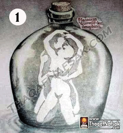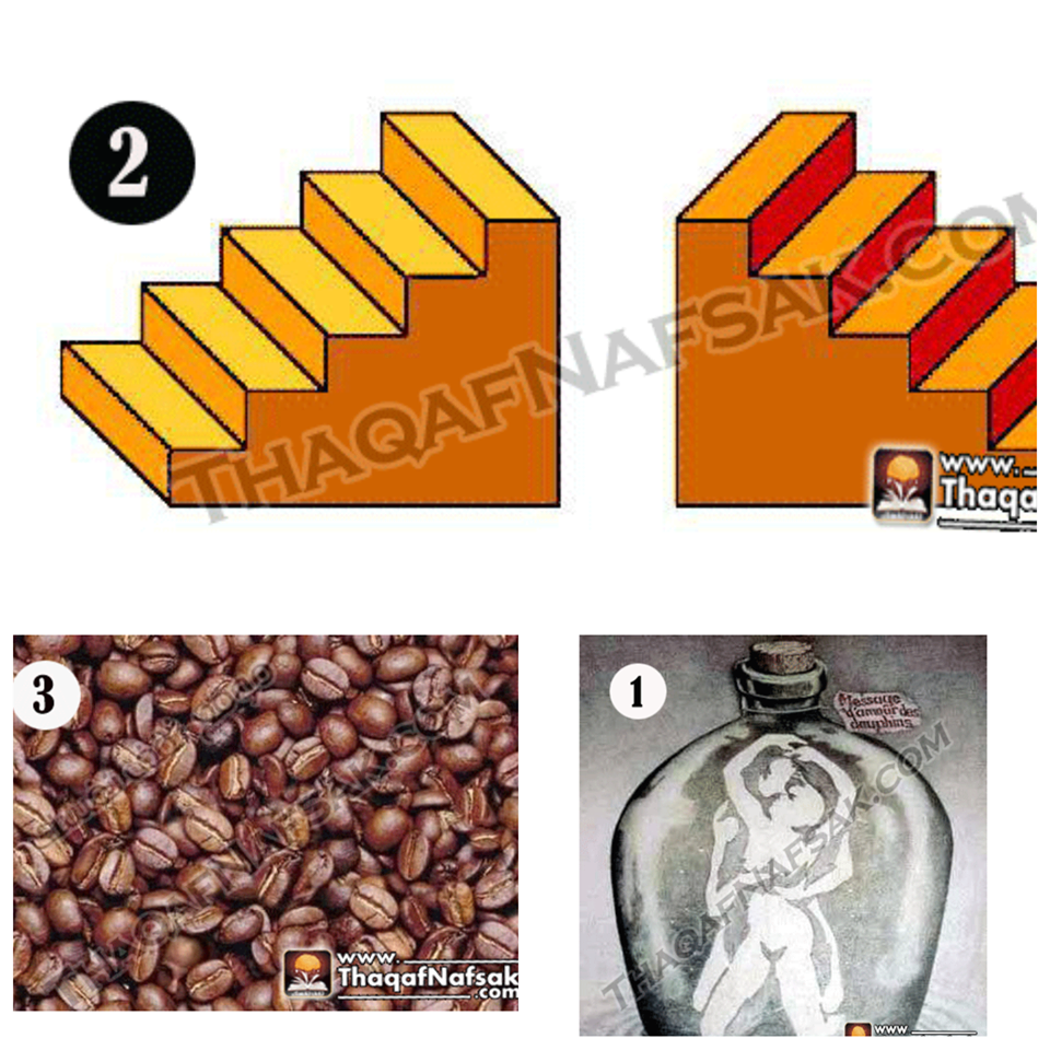 بالنسبة للصورة الأولي هناك إحتمالين بالنسبة للصورة الأولي فهناك أشخاص يروا أول شئ في الصورة  إثنين من الدولفين والإحتمال الثاني هو زوجين معاً علي الزجاجة .