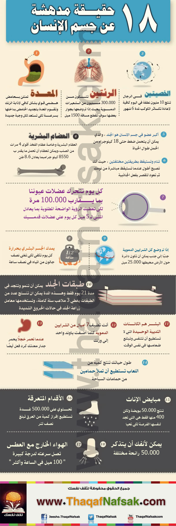 جسم الإنسان ملئ بالأسرار التي أودعها الله فيه فالله سواه فأحسن خلقه. ونعرض عليكم هذا الإنفوجراف الذي يلخص لكم 18 حقيقة متنوعة عن الجسم البشري