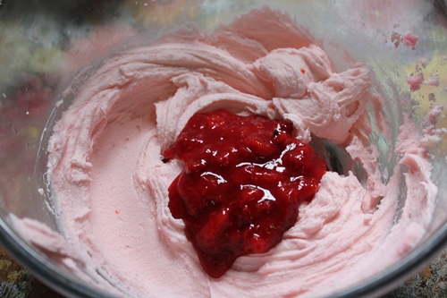 تحتاجي في هذه الخطوة إلي إضافة معجون الفراولة وعندما تتضاعف كمية الخليط يمكنك إضافة مزيج الطحين المتبقي لديك .