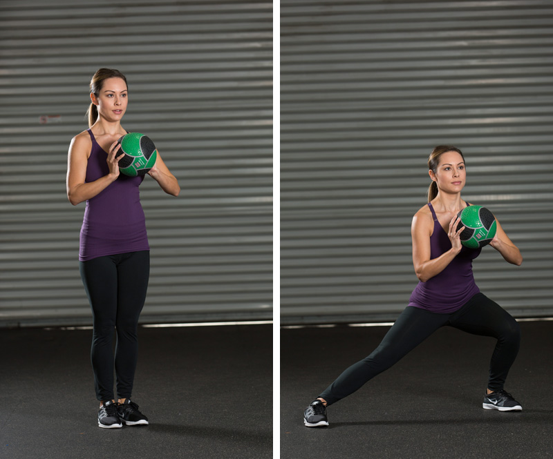 البدء بالوقوف مع فتح القدمين بعرض الوركين وعقد الكرة الطبية في مستوي قريب من الصدر. ثم القيام بإتخاذ خطوة إلي اليسار والقرفصاء إلي أسفل علي الساق اليسري عن طريق ثني الركبة وخفض الجسم حتي يصبح الفخذ الأيسر في موزاية الأرض في هذه الوضعية يجب أن تشير أصابع القدم إلي الأمام والركبة اليسري في خط مستقيم مع الفخذ الأيسر والإندفاع بقوة الجسم مرة أخري إلي وضع البداية عن طريق دفع الجسم بالقدم اليسري وتكرار نفس الخطوات مع القدم اليمني .