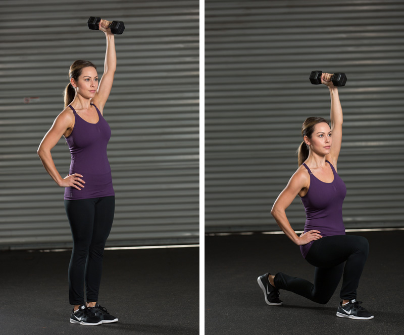 الوقوف مع فتح القدمين بعرض الكتفين واليدين بجوار جانب الجسم وعقد الدمبل بين يديك اليمني وتمديد الذراع الأيمن لأعلي ويجب التأكد من القبض علي الدمبل بشكل جيد وأخذ خطوة إلي الأمام بالساق اليسري وضرب الأرض بالساق اليسري لتحقيق إستقرار الركبة اليسري وثني الركبة اليسري لخفض الجسم بالتدريج نحو الأرض والوقوف علي الجانب الأيسر أثناء إتخاذ موقف الإندفاع .