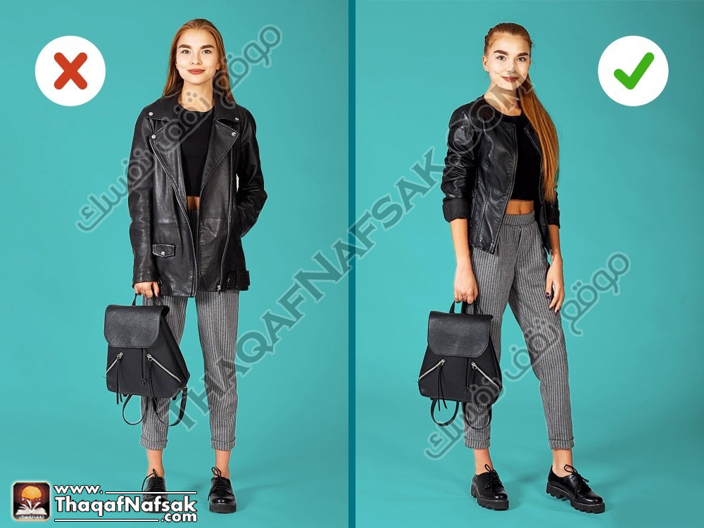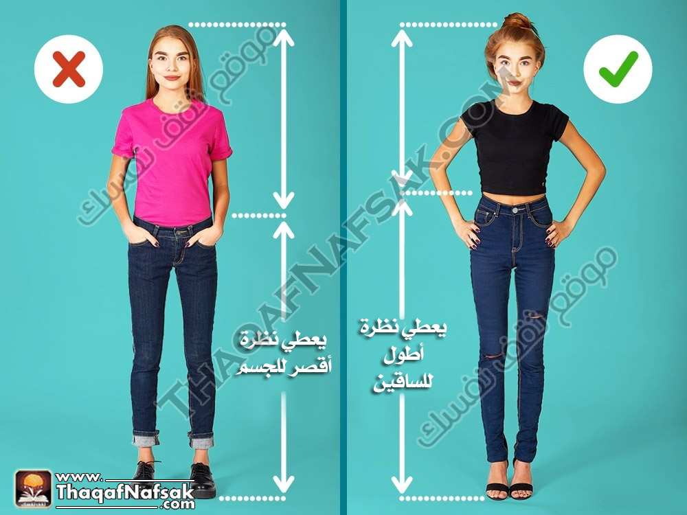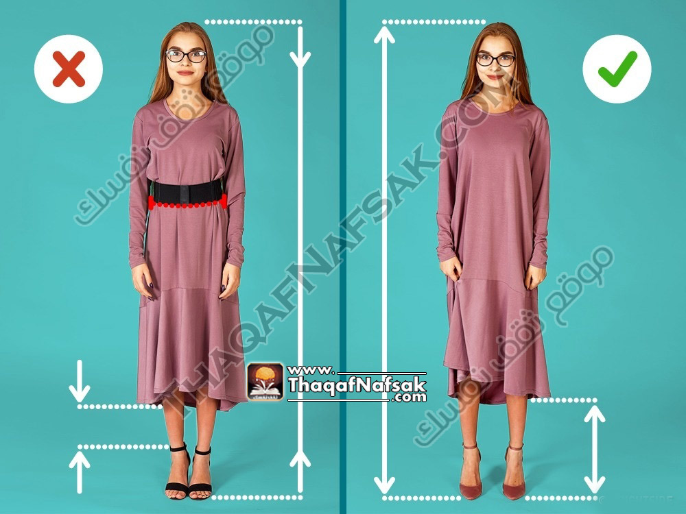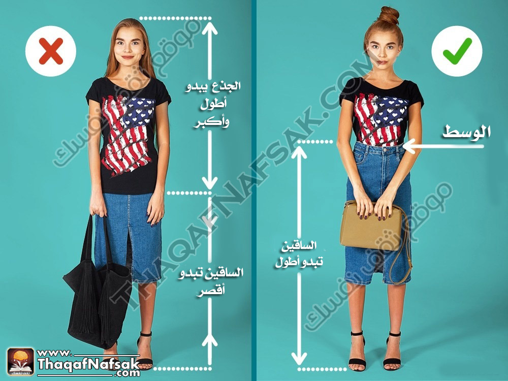 لكي تظهري بشكل جيد لا يجب أن تنسي نسب الأرقام الصحيحة . إختيارك لملابسك يلعب دور هام من خلال إختيار البلوزات بالمقاس المناسب لك مما يجعل الجذع الخاص بك يبدو أكبر واطول في حين يمكنك إختيار تنورة أقصر قليلاً وإرتداء الجورب المناسب . يفضل وضع البلوزات بداخل التنورة حتي تسلط الضوء علي الخصر . فهذه الطريقة تساعدك في إطالة الساقين .