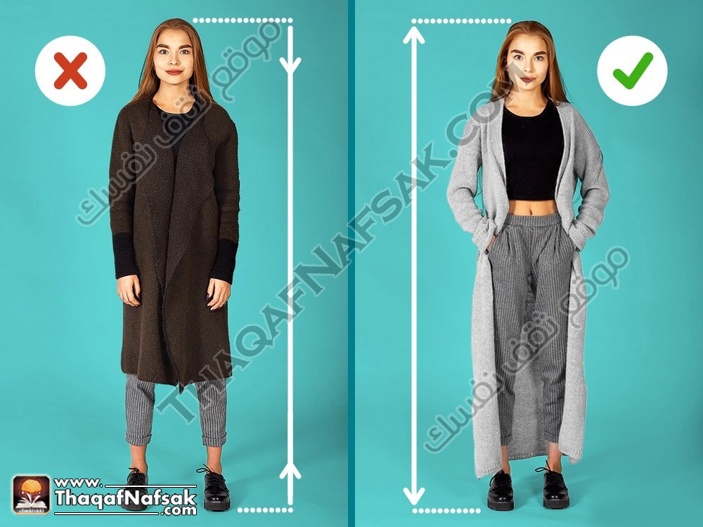 الكارديجان الطويل المحبوك يقدم حل سهل ويضيف بضع بوصات إلي طولك بدون مساعدة من الكعب العالي . هذه الملابس تقدم وظيفة مثالية لخلق خط رأسي بدون إنقطاع للجسم، مما يعزز بشكل واضح طول الجسم . بطبيعية الحال، لا يجب أن يكون الكارديجان ضخم جداً أو لديه تفاصيل كبيرة بشكل واضح مثل الجيوب الكبيرة .