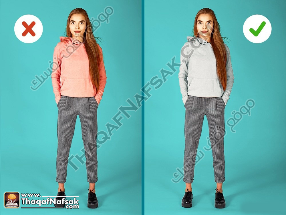 الألوان المختلفة للملابس مثل ارتداء ألوان مشرقة وألوان داكنة في الجزء الأسفل . يرجي الملاحظة أن الألوان الزاهية تبدو ضخمة أكثر. في الصورة يصبح لون البلوزة مختلف قليلاً عن اللون الموجود في الملابس الأسفل .