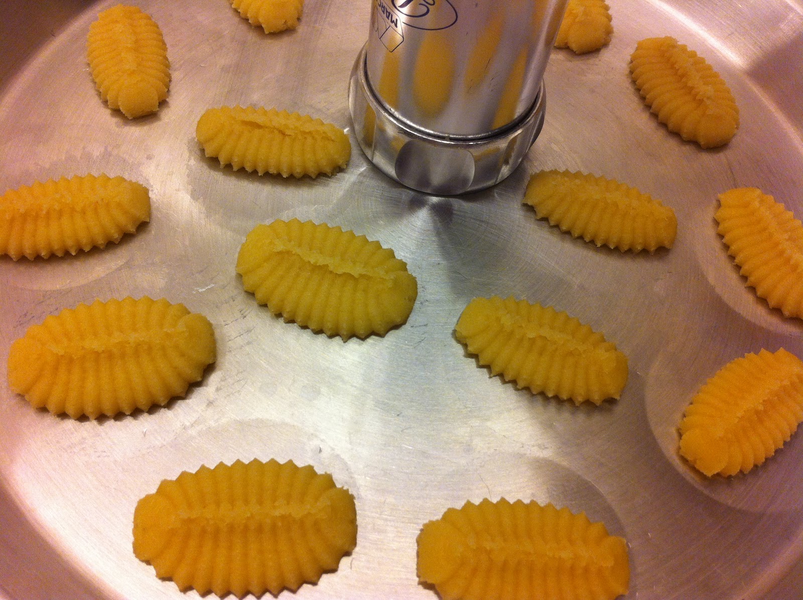 تقسيم العجين ، و وضع مقدرار من العجين في قالب البيتفور و عمل الشكل الذي ترغب فيه . ( يمكنك إستبدال قالب البيتفور ، بكيس التزيين مثبت فيه قمع مزخرف ) وضع القالب فوق الصينية ، و تنزيل قطع البيتيفور . الإستمرار في ذلك حتي تمتلئ الصينية و ترك مسافة 1 سم بين كل قطعة و الأخري .