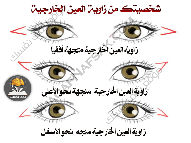 زاوية العين المائلة : الأشخاص الذين لديهم عيون مائلة إلي الأسفل، عادة ما يكونوا متشائمين ومنقادين ولكن عند النظر للجانب الإيجابي فإنه من السهل تكوين صداقات معهم .