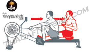 ** احتفظ بظهرك مستقيمًا وقم بشد الحبل الخاص بالماكينة مع فرد القدمين لتعود إلى الوراء