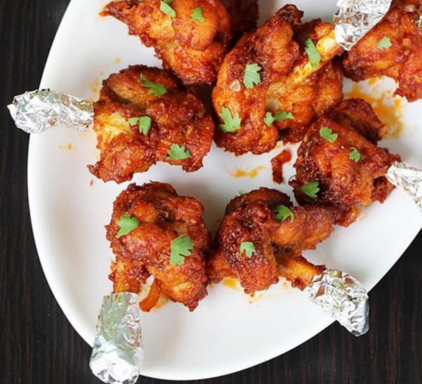 15- قم بتزين الطبق بأوراق الكسبرة, و قم بلف نهايات أجنحة الفراخ بورق الفويل مثل الصورة, و يقدم كمقبلات بجانب الطبق الرئيسي