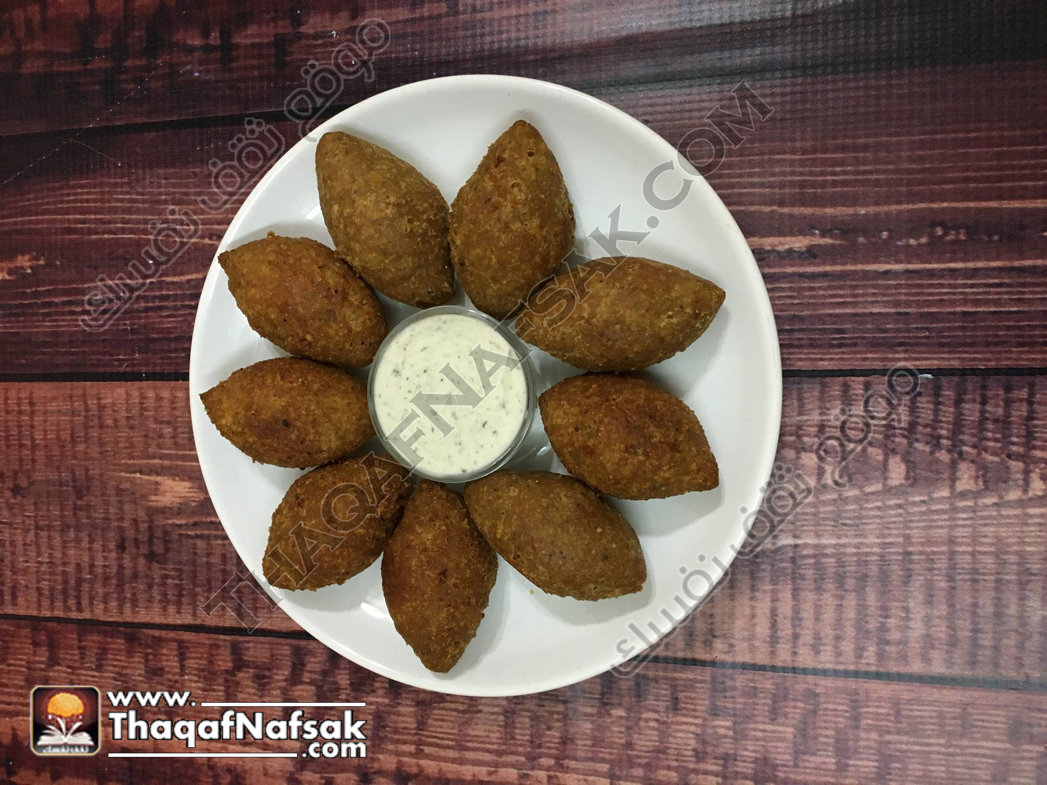 - نقوم بتشكيل عجينة البرغل على شكل جراب وتحشوها باللحمة المعصجة سابقا ونغلق هذا الجراب كما هو موضح بالصور .