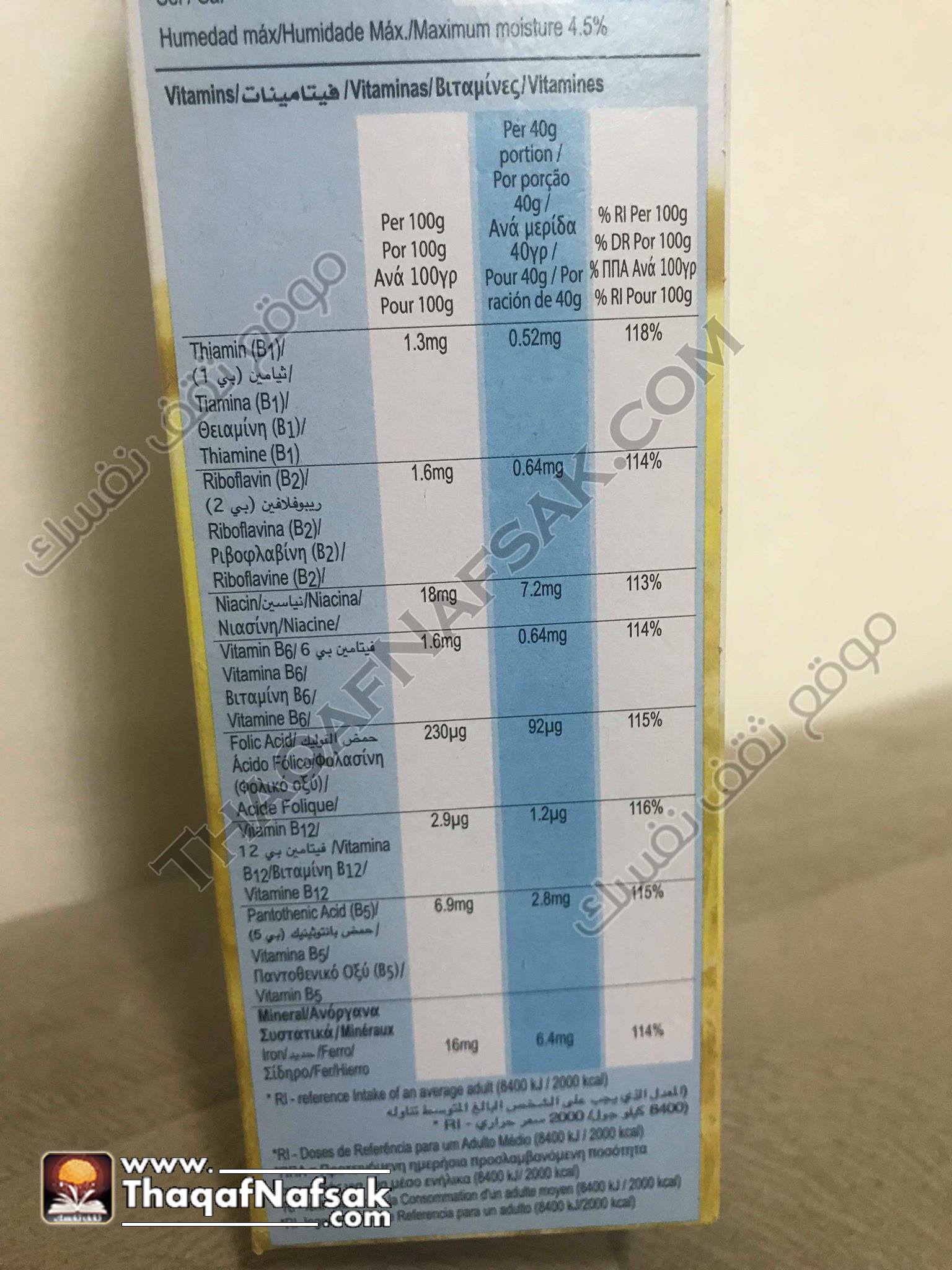 قمح كامل ( 80 % ) ، نخالة القمح ( 20 % ) ، سكر ، مستخلص نبات الشعير ، ملح ، نياسين ، حديد ، حمض البننتوثيانيك ( B5 ) ، ثيامين ( B1 ) ، ريبوفلافين ( B2 ) ، فيتامين B6 ، حمض الفوليك وفيتامين ( B12 ) .