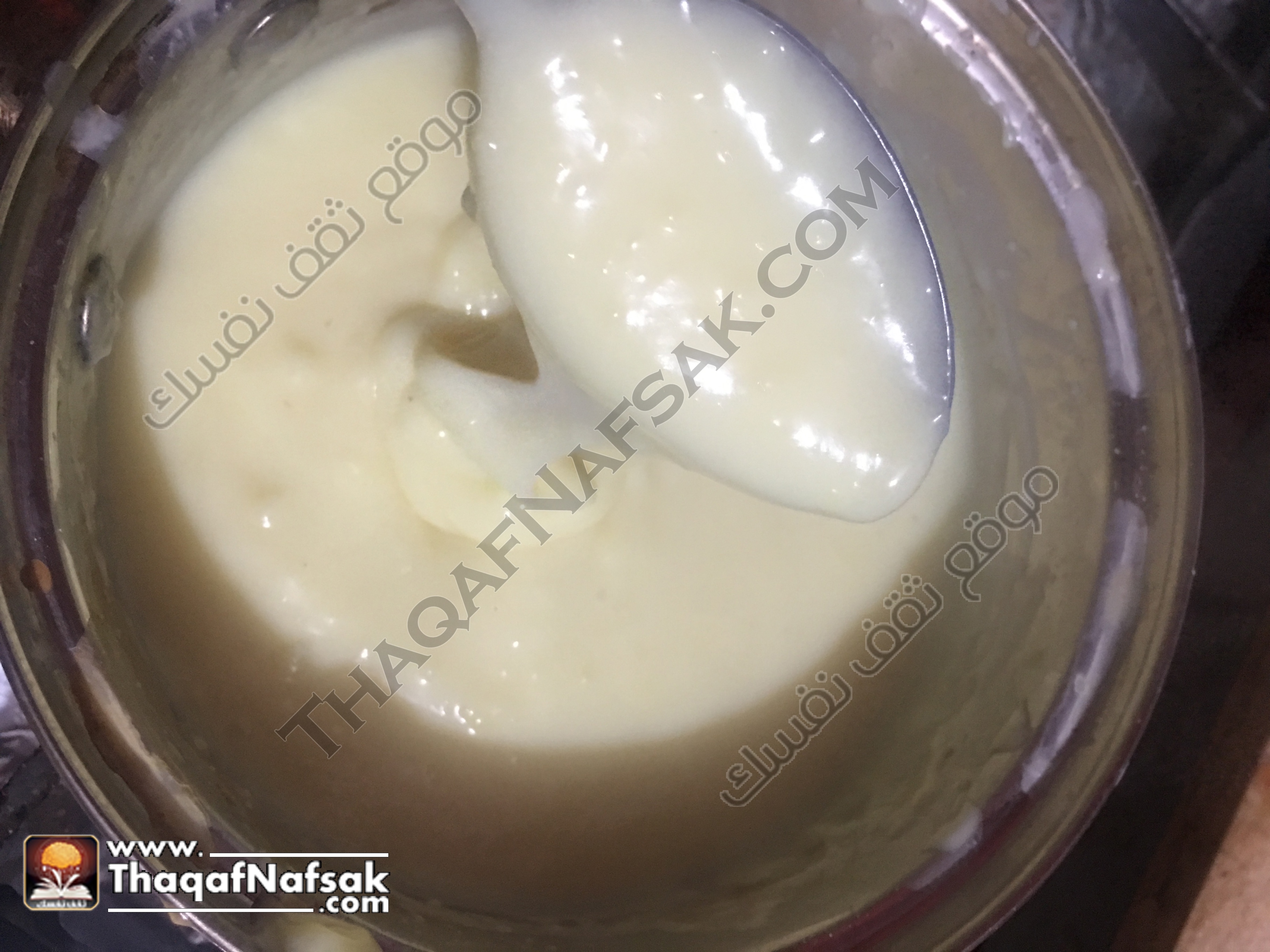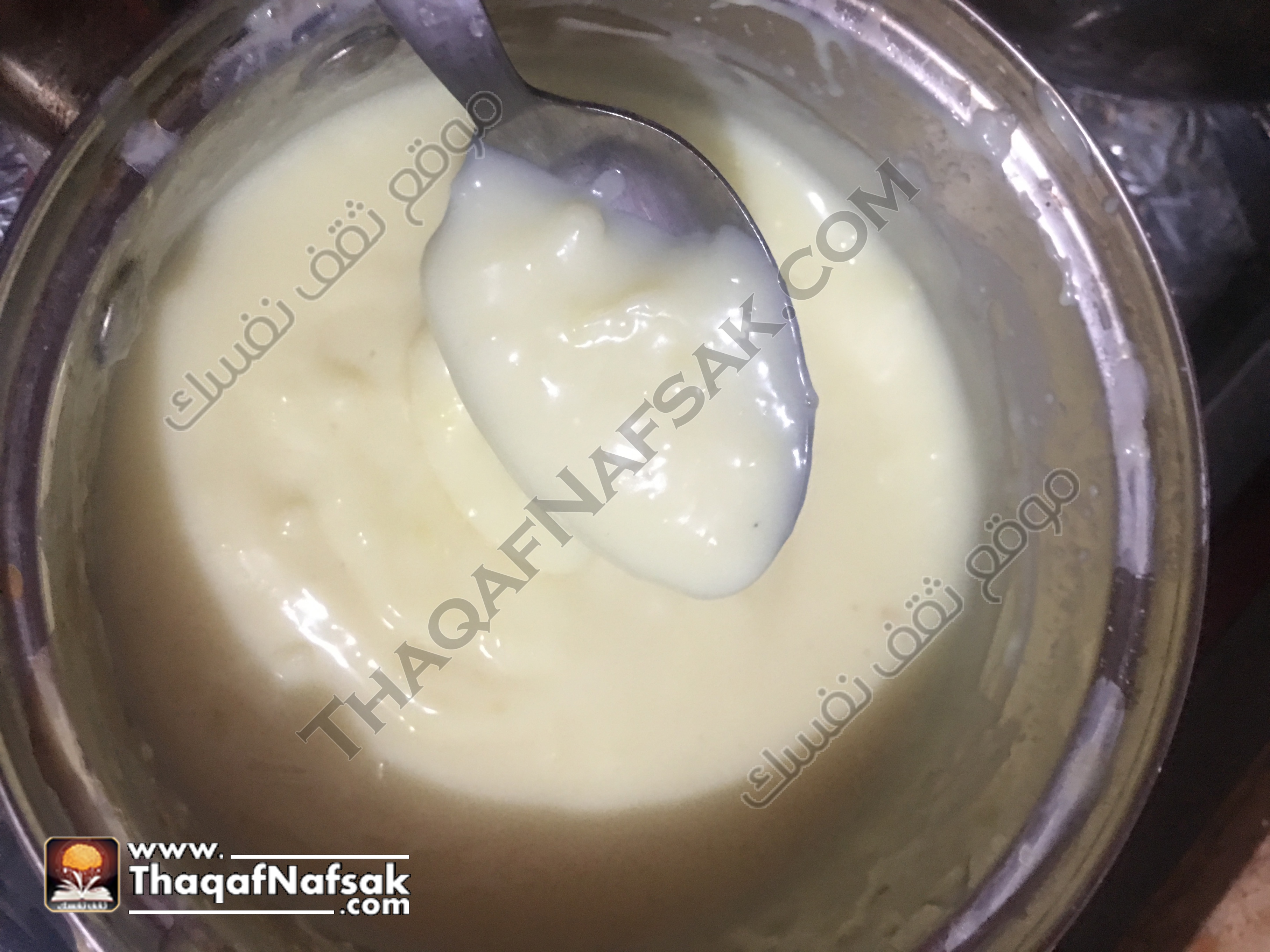 – ذوّبي الكاسترد بالحليب ع البارد، ثم ضعي السكر وضعي القدرٍ على النار.