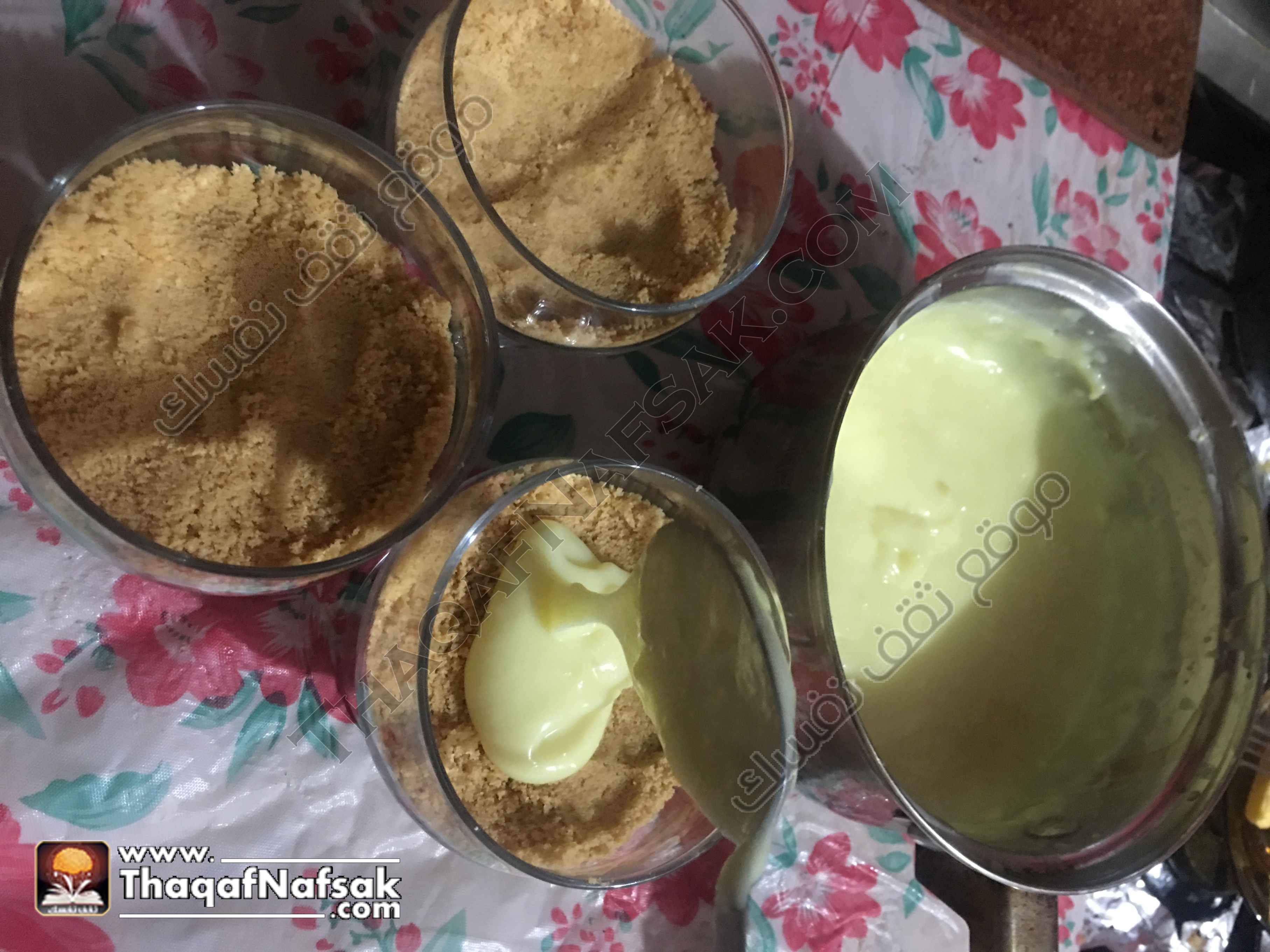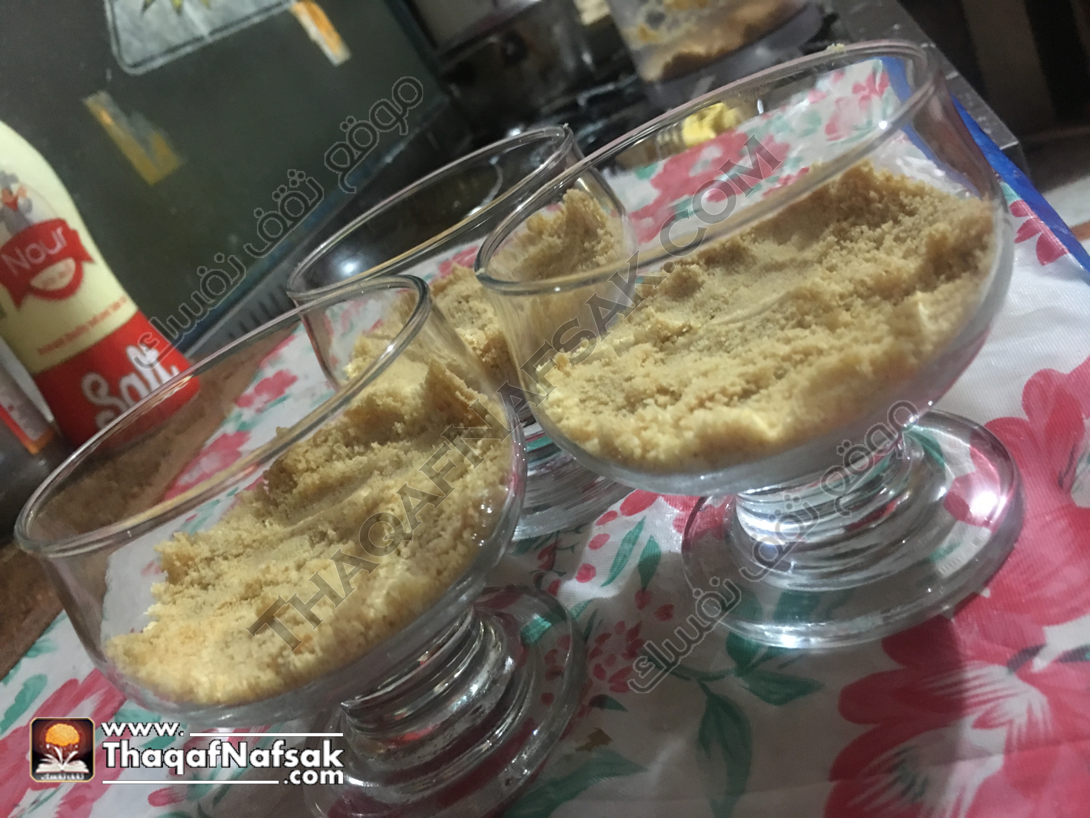ثم نضع البسكويت المرمل في الكاسات او في قالب حسب الرغبة ونضغط عليه كي يتماسك .