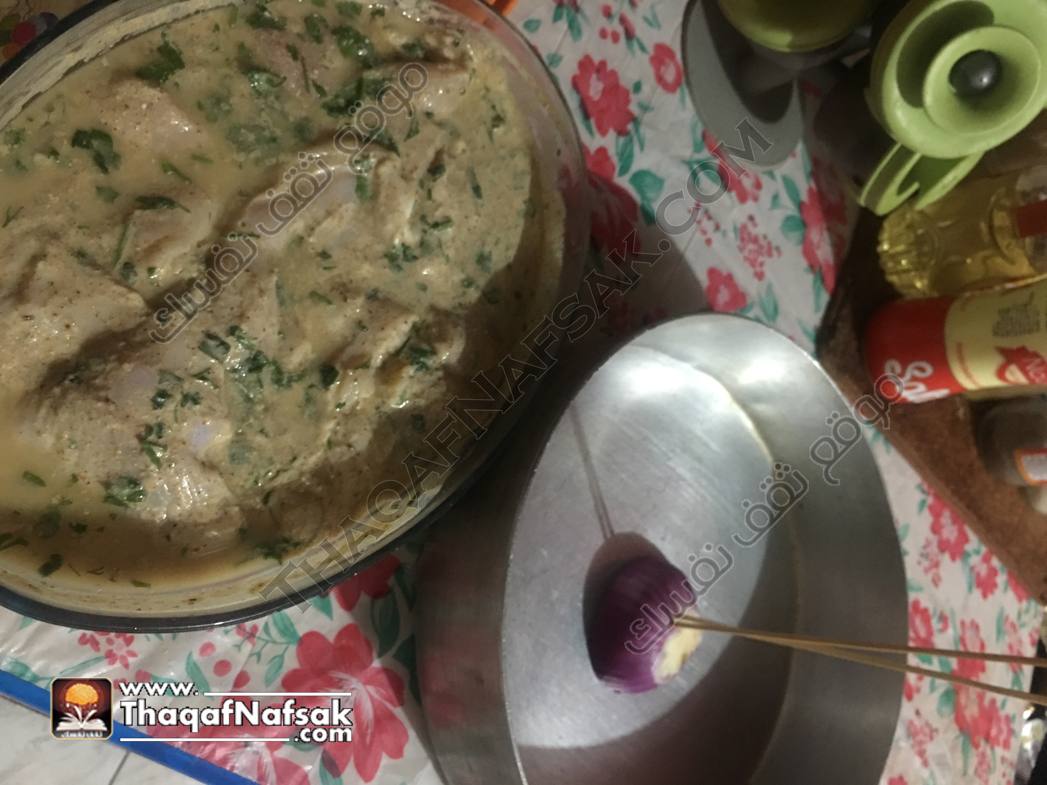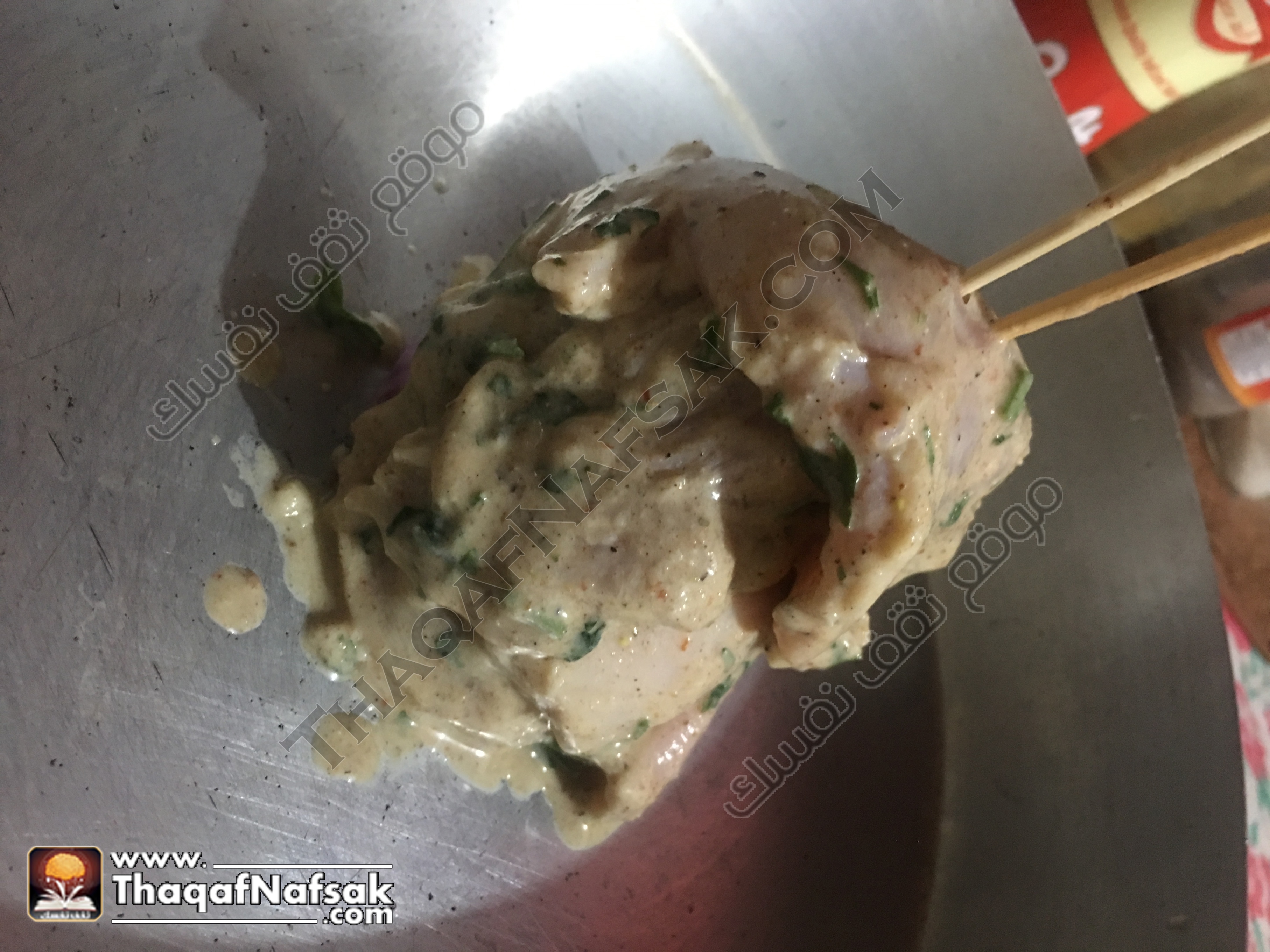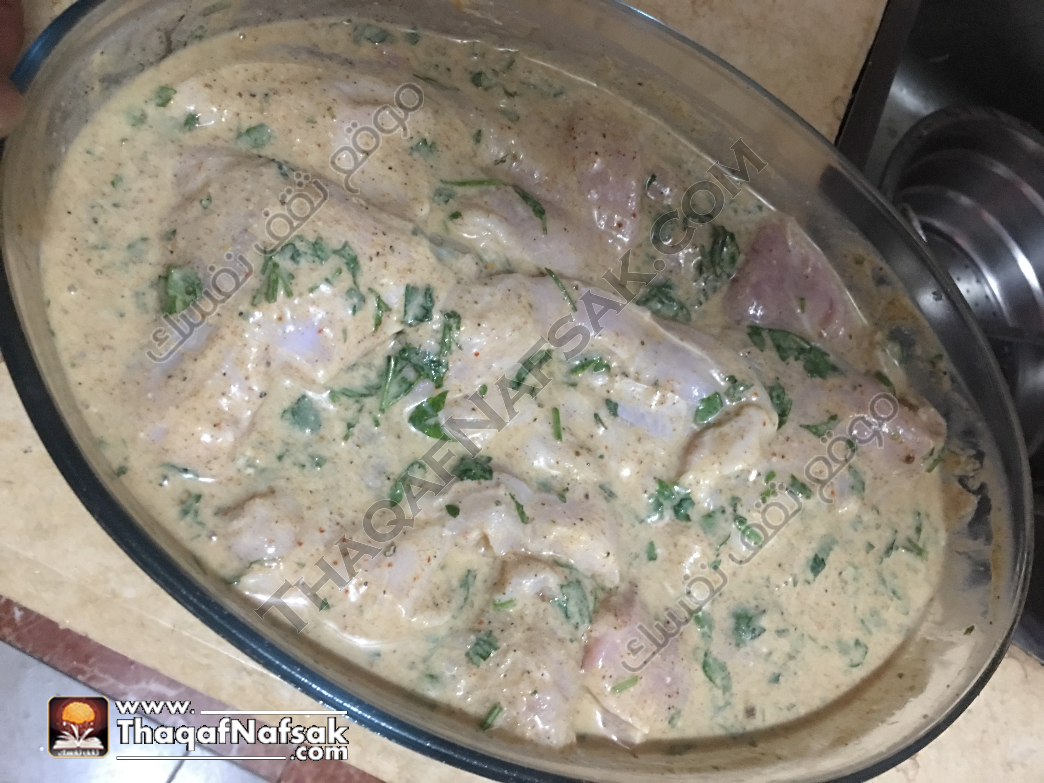 2- لعمل التتبيلة : عن طريق وضع الزبادي والبهارات والبقدونس معا في بولة غويطة ونقوم بمزجهم بشكل جيد .