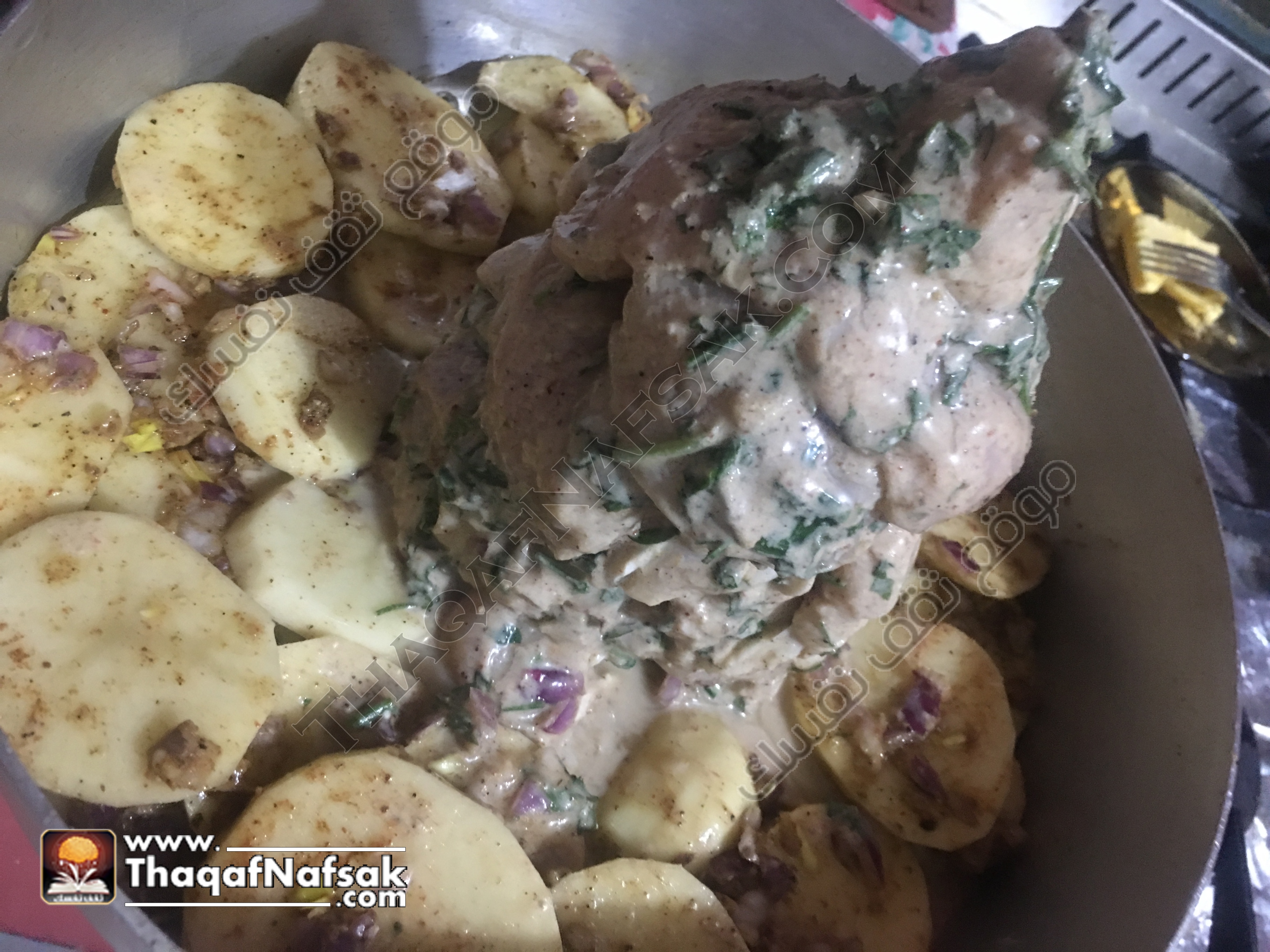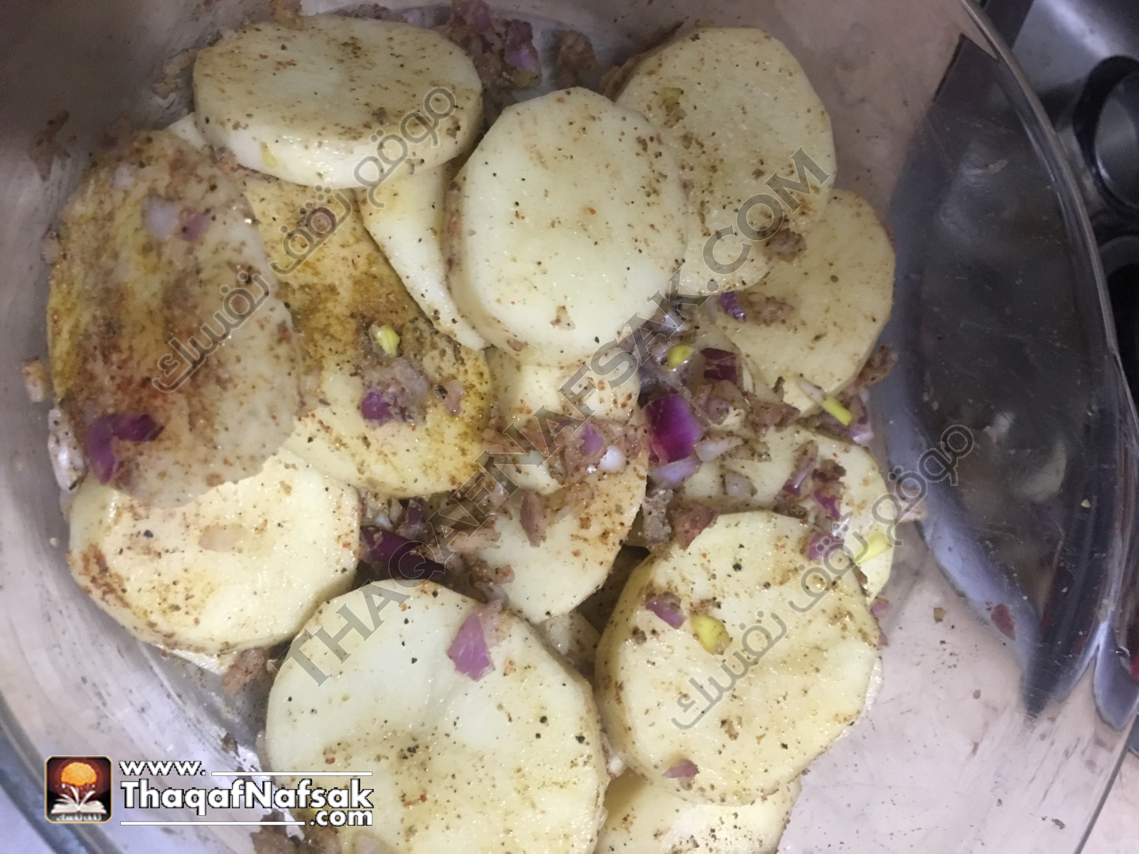 9- بعد ذلك نقوم بوضع البطاطس المتبلة حول سيخ الشاورما في الصينية . وتوزيعها بشكل متساوي .