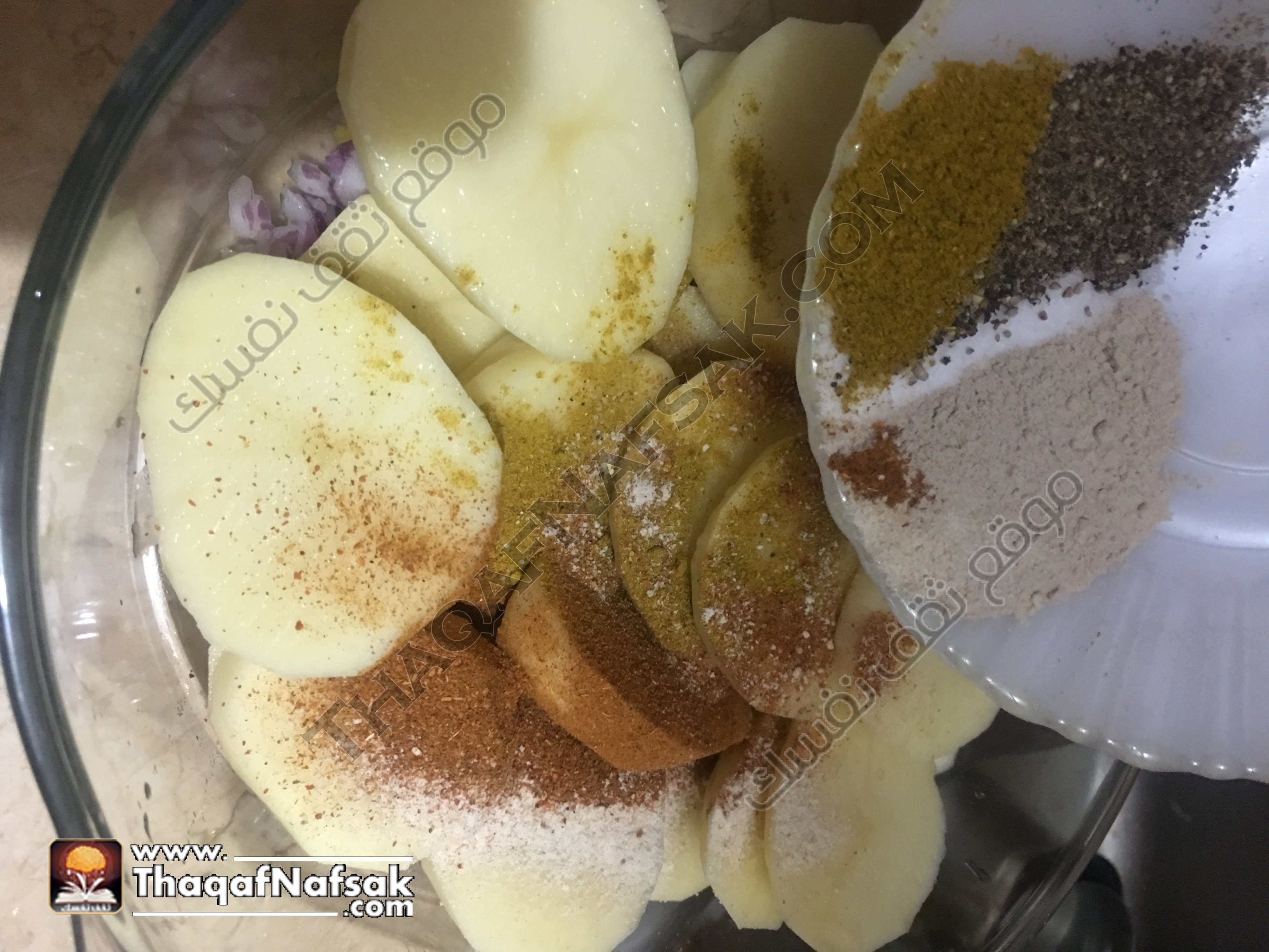 7- بعد ذلك ضيفي البصل إلى البطاطس وعليها ضيفي الملح والفلفل والشطة والثوم والبصل البودر .