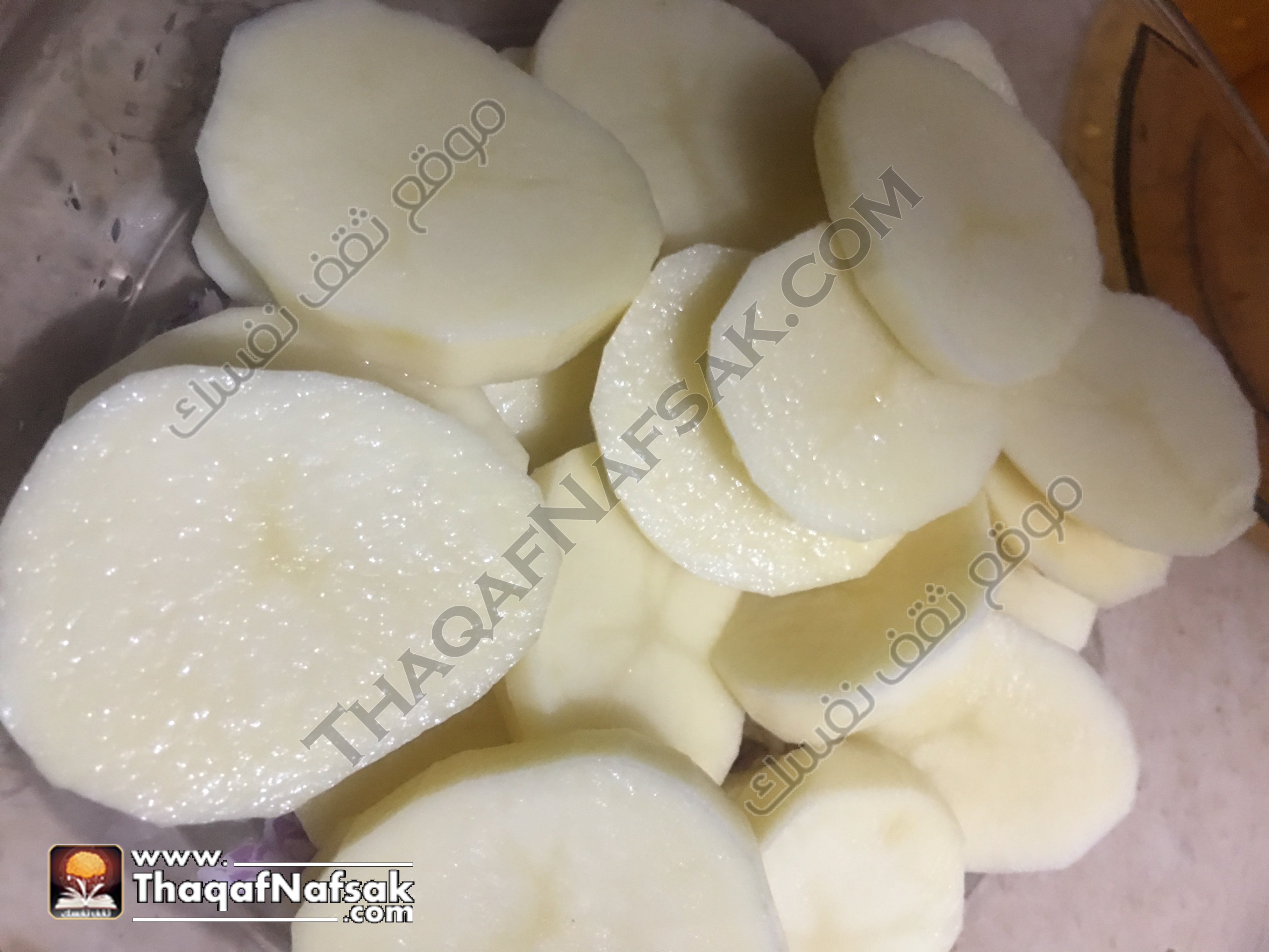 5- قشري البطاطس واغسليها جيدا وقطعيها إلى شرائح مدورة متوسطة الحجم .