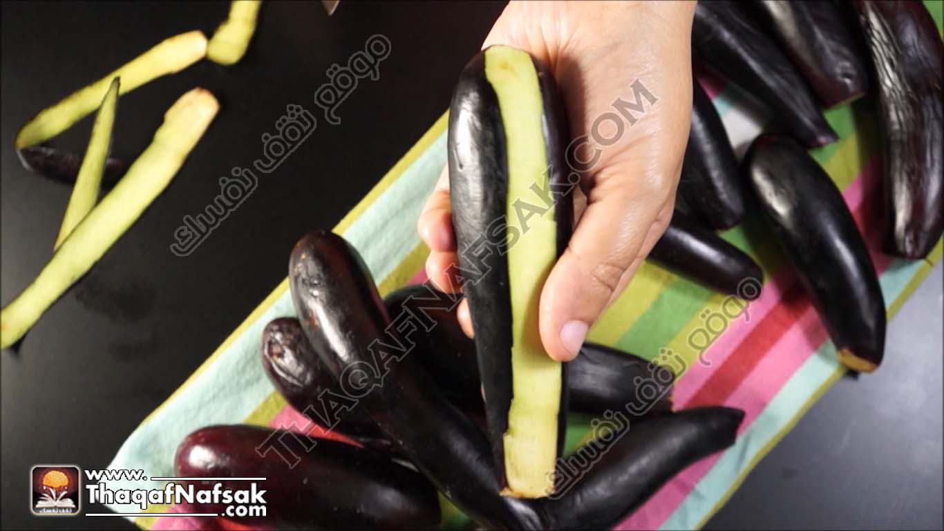 بعد ذلك نقوم بإحضار الباذنجان ونقشره نصف تقشير كما هو واضح في الصورة