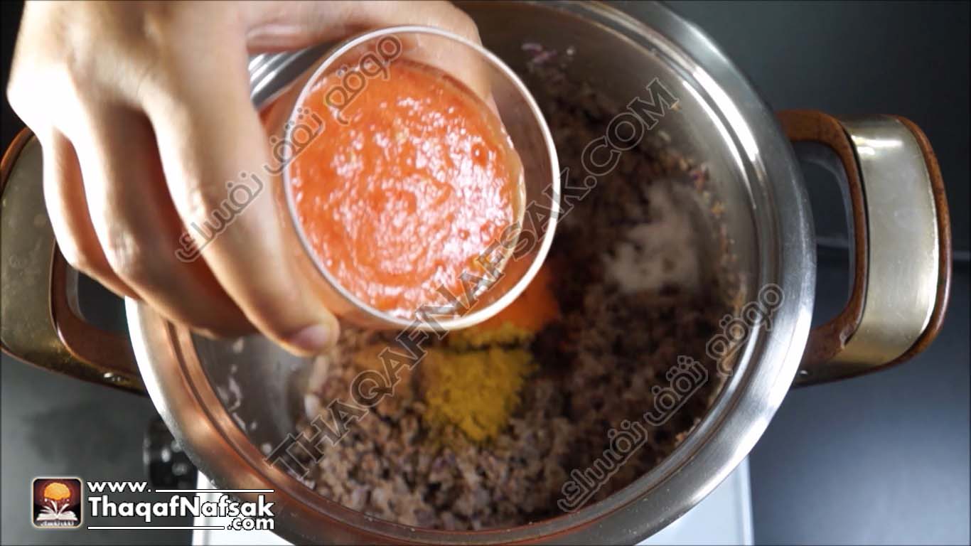 بعد إضافة البهارات نقوم وضع كوب من عصير الطماطم على اللحم ونقلب جيدا حتى تتجانس البهارات والطماطم مع اللحم وننرك على نار هادئة إلى أن تنضج .