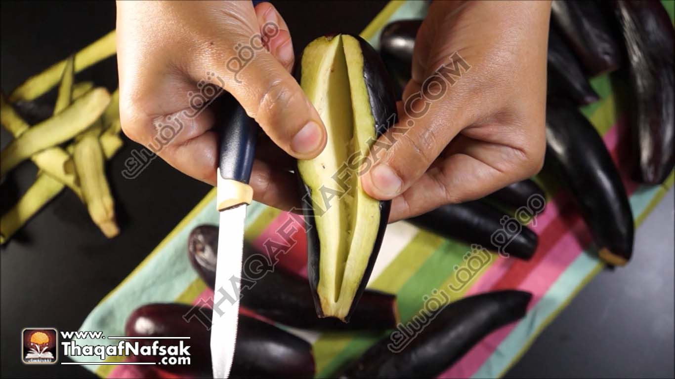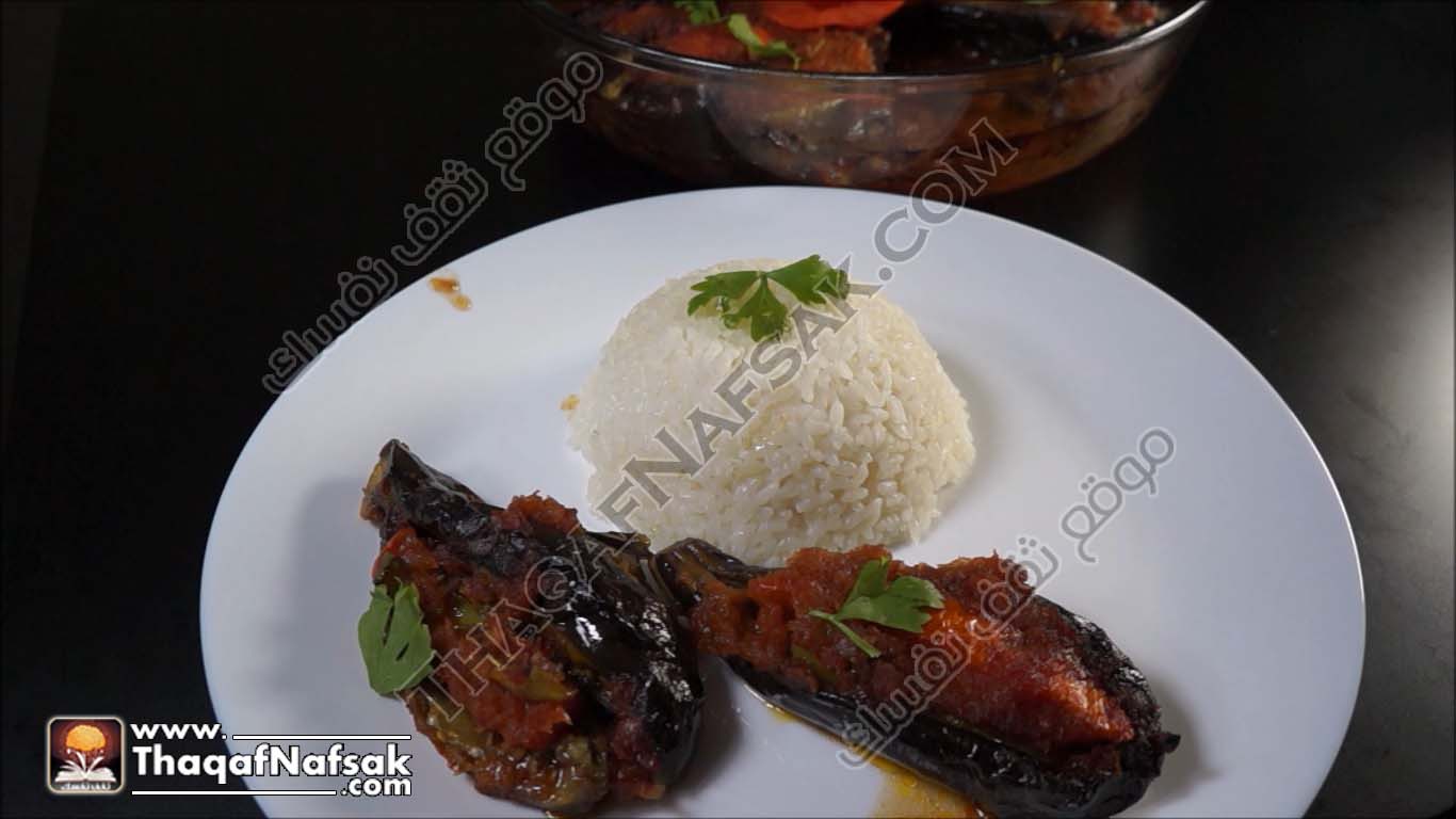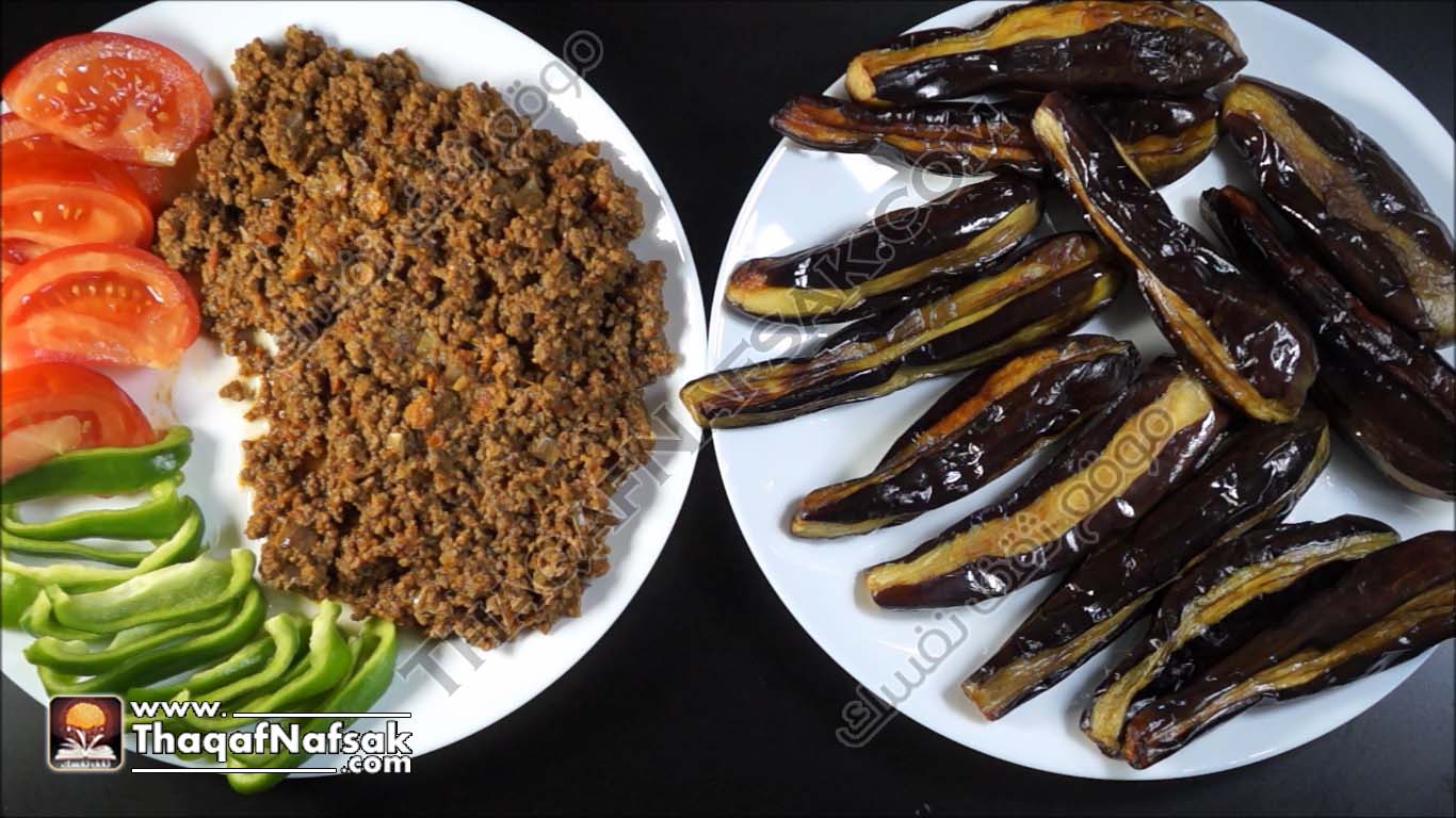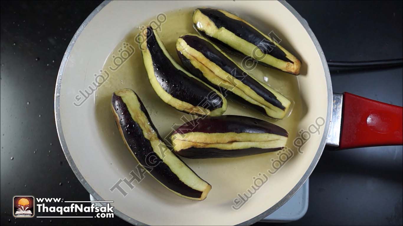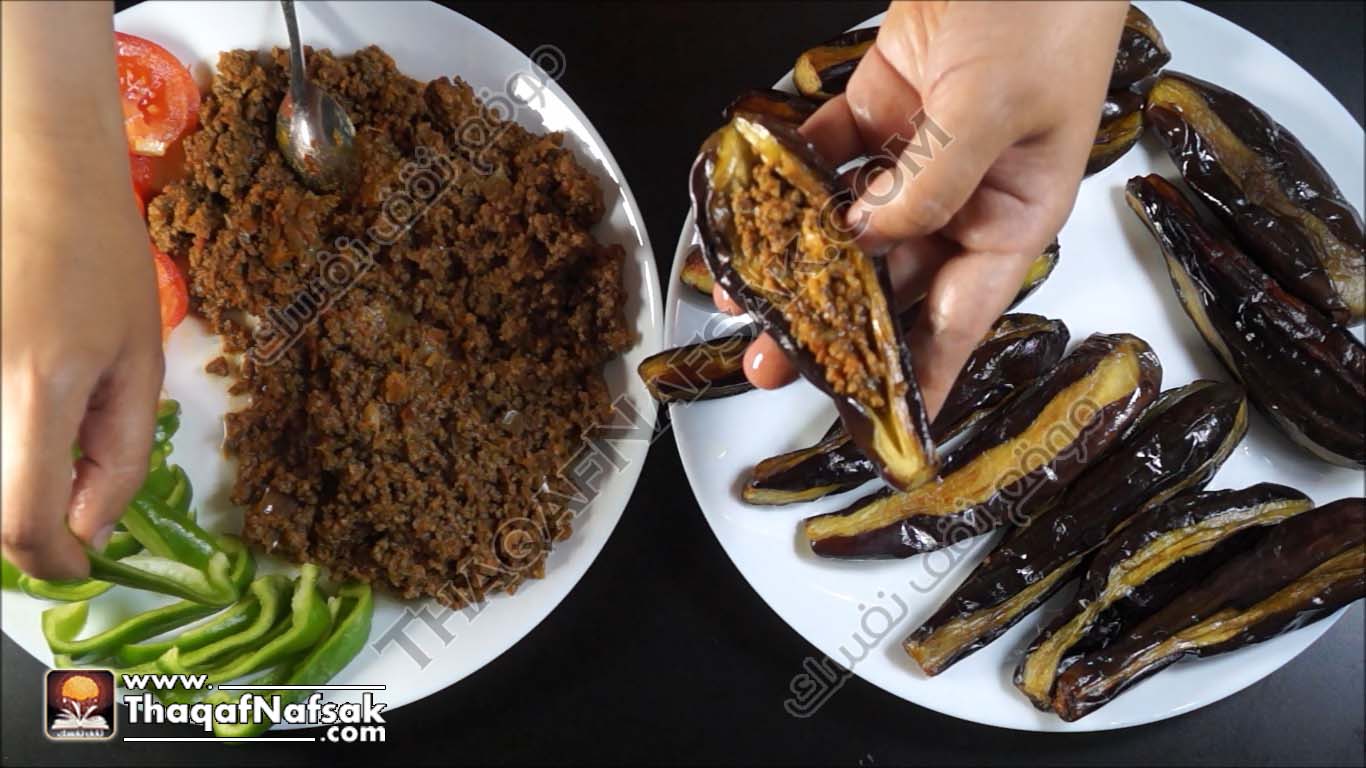 نقوم بفتح شقوق الباذنجان وحشوها باللحم المفروم المعصج ومعها شريحة من الفلفل الأخضر الطماطم .