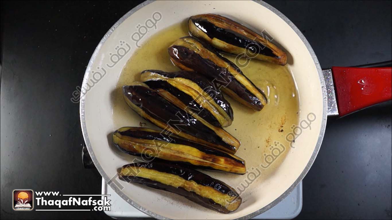 بعد أن يسخن الزيت نقوم بإضافة الباذنجان .