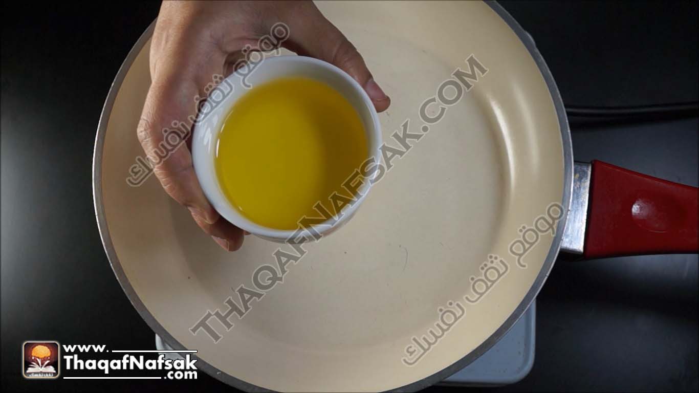 نقوم بإحضار طاسة نضعها على النار متوسطة ثم نقوم بإضافة الزيت .