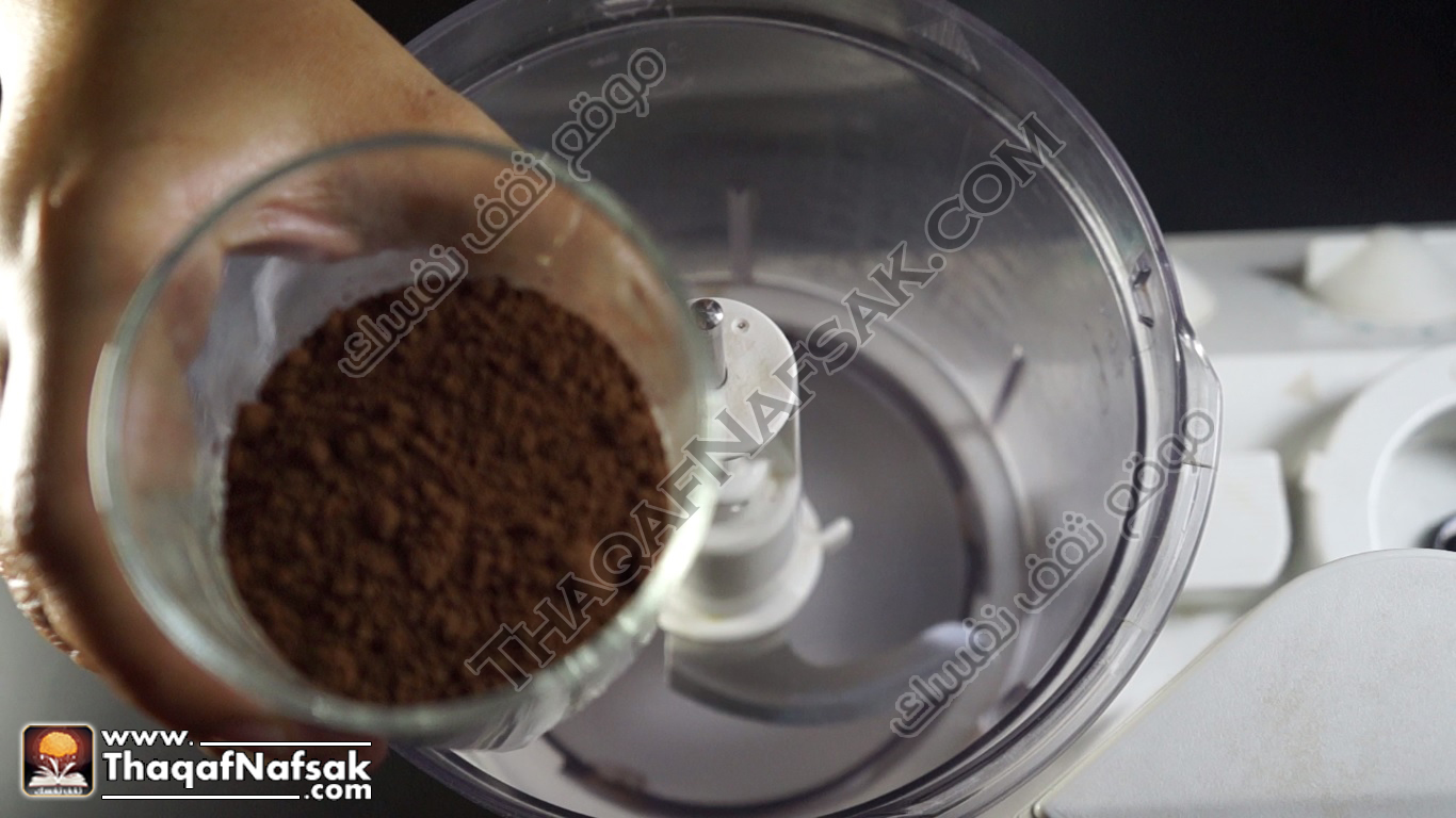 - نضع الكاكاو الخام والسكر في الخلاط وبفضل استخدام الكاكو الخام لانه ذو لون اغمق وطعم مركز .