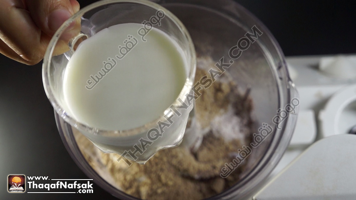 - ثم نقوم بإضافة الحليب ونضرب جيدا حتى يتم تجانس المكونات مع بعضها البعض .