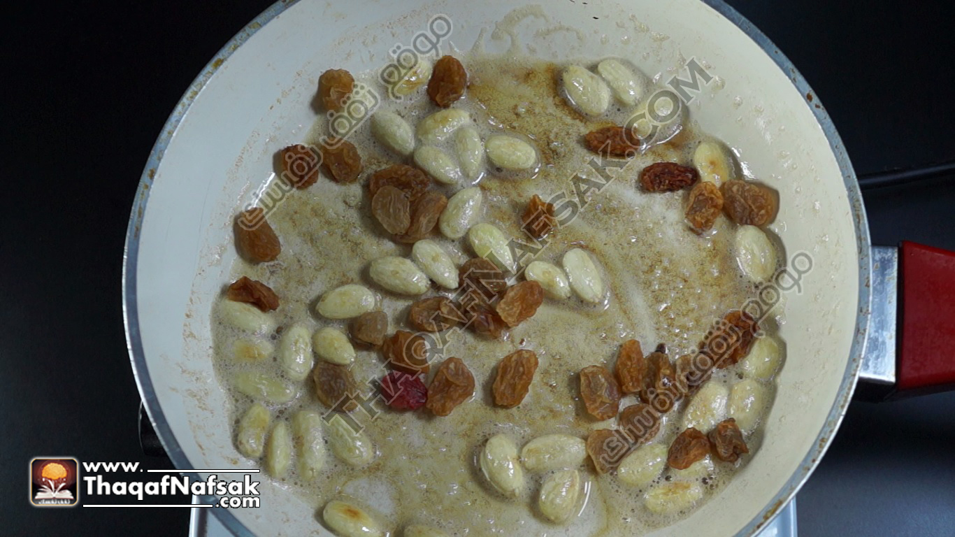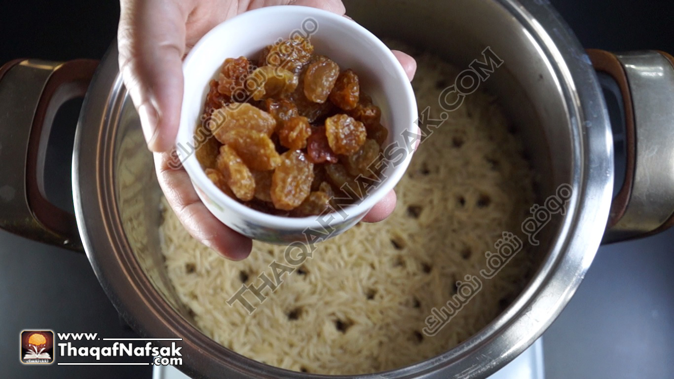 • بعد ذلك نضيف نصف كوب من الزبيب بعد تشرب الماء ثم نغطي الوعاء ونهدئ النار ونترك الأرز على النار الهادئة حتى ينضج تماما
