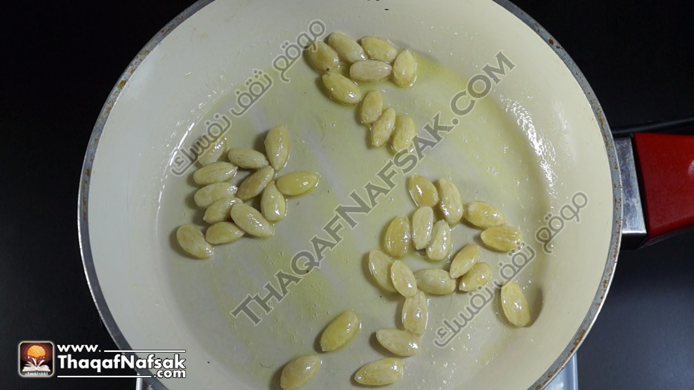 • في طاسة على النار نضع ملعقة من الزبدة ثم نضيف إليها اللوز بعد تقشيره .