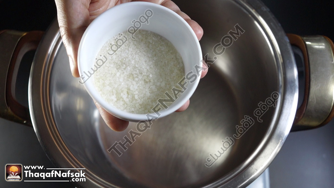 • نفي البداية نقوم بغسل الأرز جيدا ونصفيه من الماء ونتركه جانبا حتى نحضر السكر المكرمل .