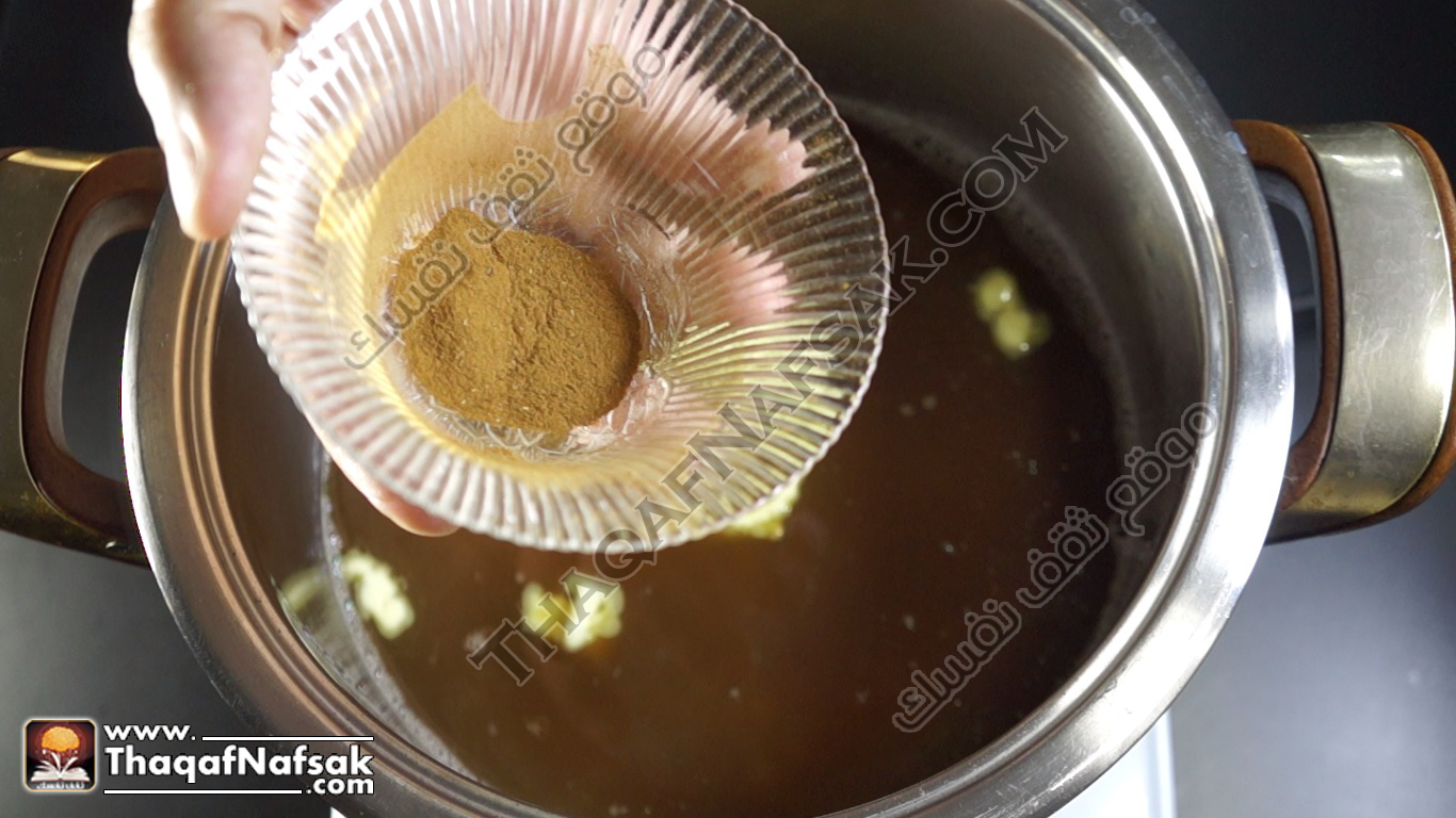 • نقوم بإضافة القرفة والملح في الحلة بعد إضافة الزبدة .