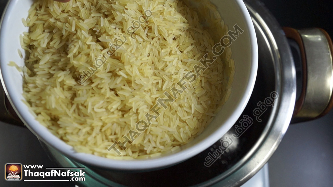 • نغطي حلة الأرز بغطاء محكم ونترك الأرز على النار حتى يتشرب الماء .