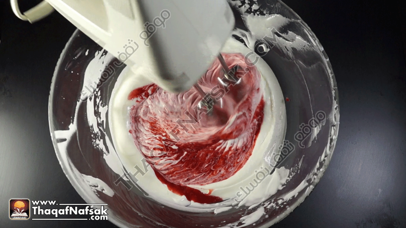 • ثم نضيف عصير الفراولة الى الجزء الثاني ونضرب بالمضرب الى ان يتمزج
