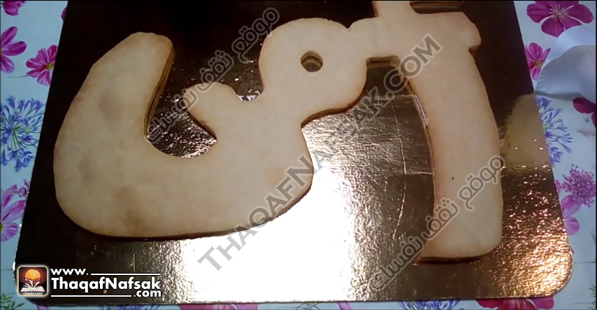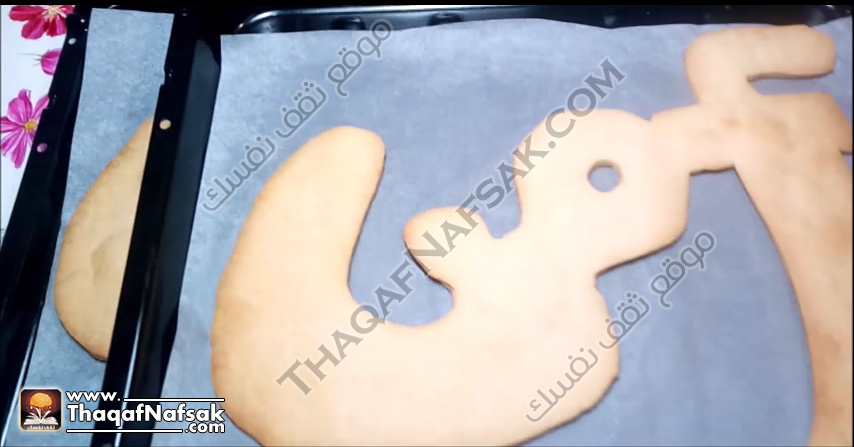 نقوم بتحضير كلمة أمي بإستخدام ورق الزبدة ووضعها على العجينة والقص حولها بإستخدام حرف سكينة لتفريغ الشكل .